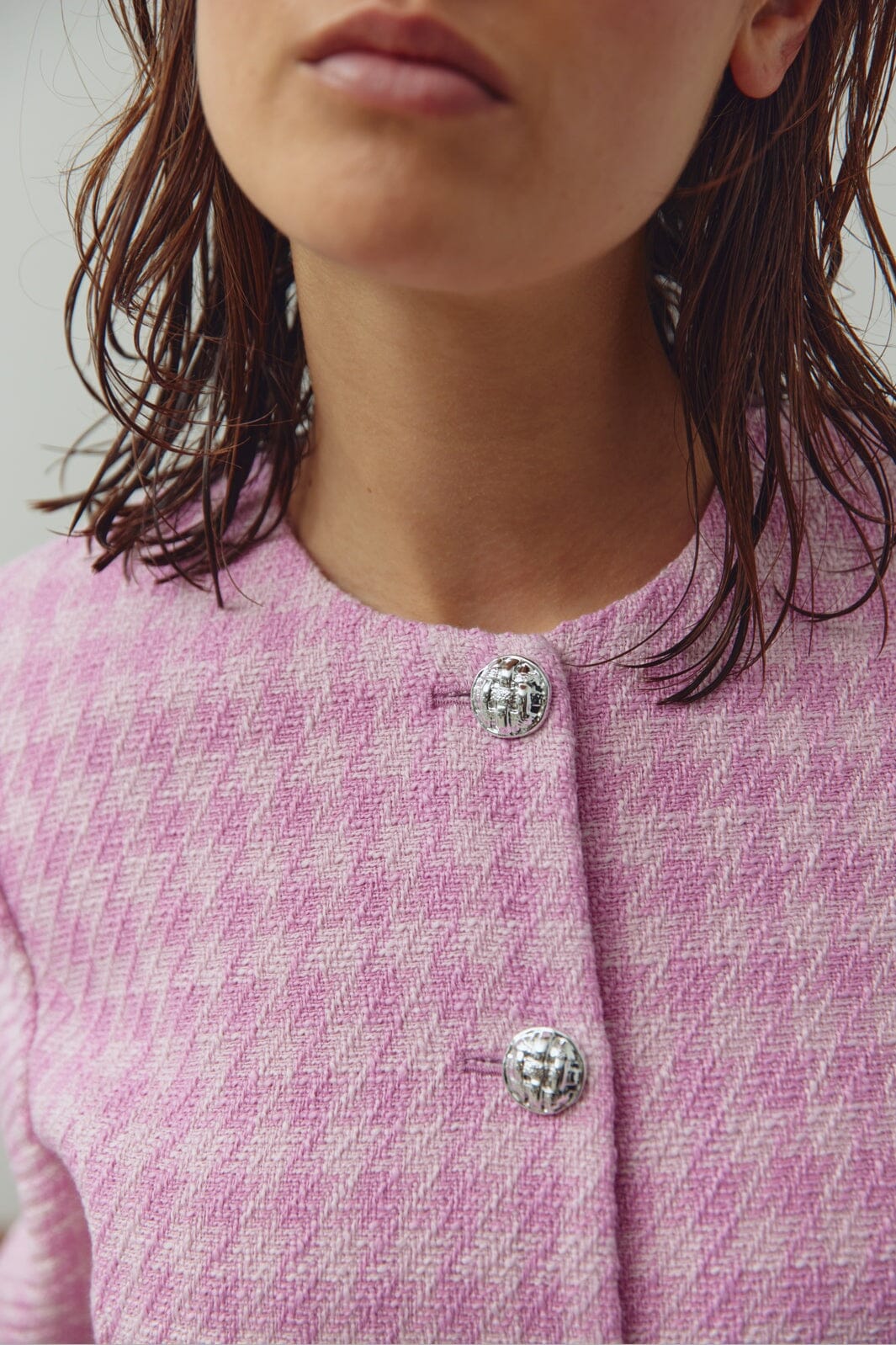 Różowa marynarka w kratę od Noella, wykonana z tkanego poliestru. Marynarka ma dopasowany krój oraz krótkie rękawy z okrągłym dekoltem.