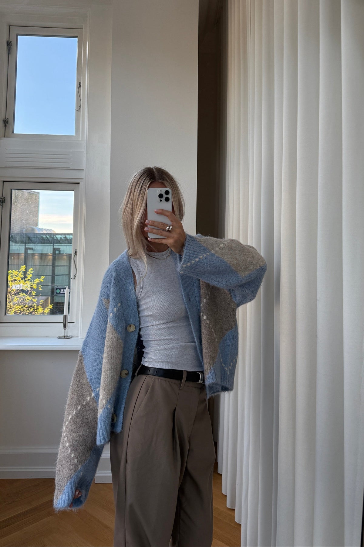 Dzianinowy kardigan od Noella z klasycznym wzorem argyle w jasnoniebieskich i beżowych odcieniach. Kardigan ma dekolt w serek i trzy guziki z przodu.