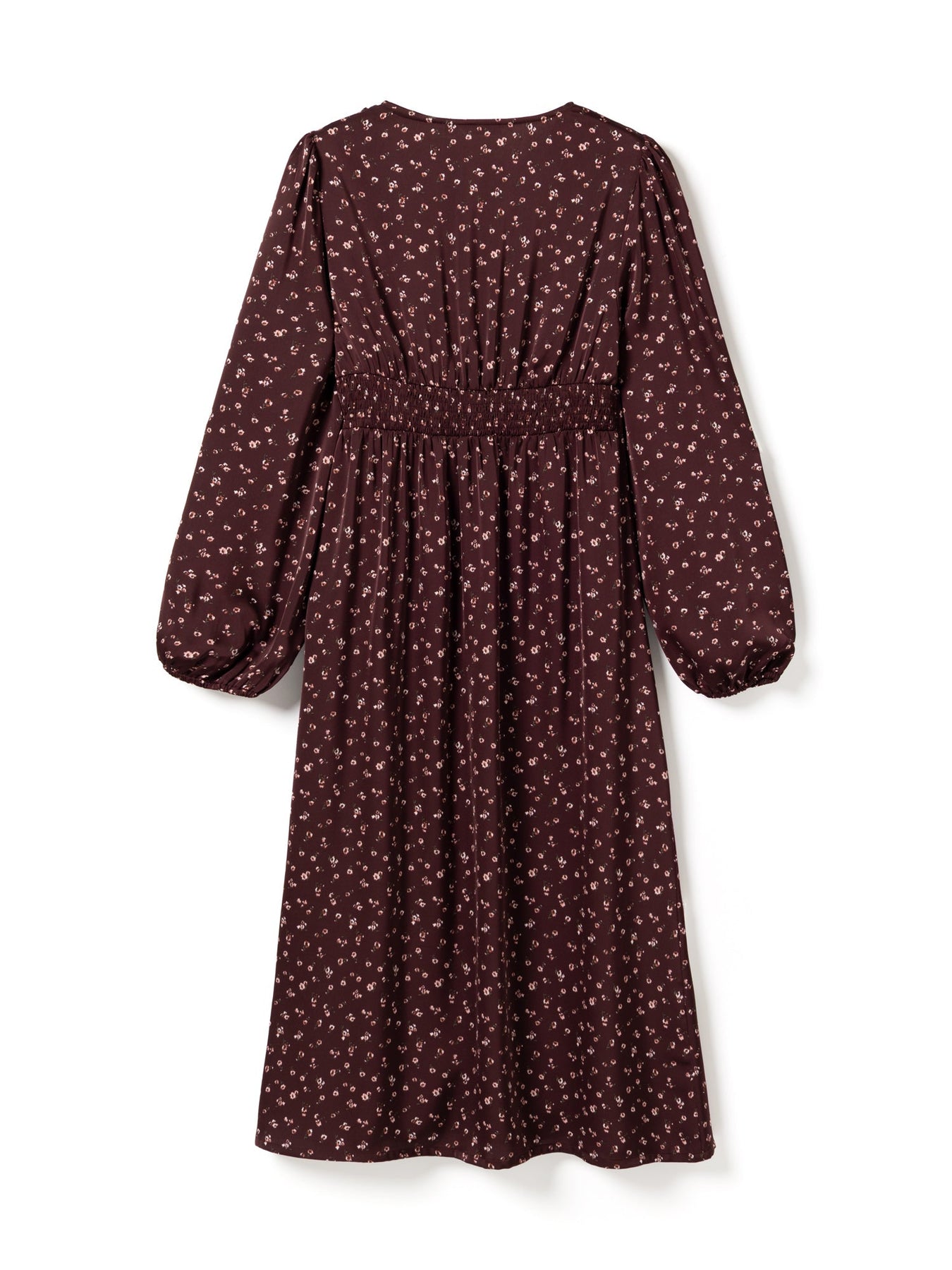 Ciemnoczerwona sukienka od Noelli z kwiatowym wzorem w odcieniach bordowych i czerwonych. Sukienka ma długie rękawy, dekolt w kształcie litery V i sięga do połowy łydki.