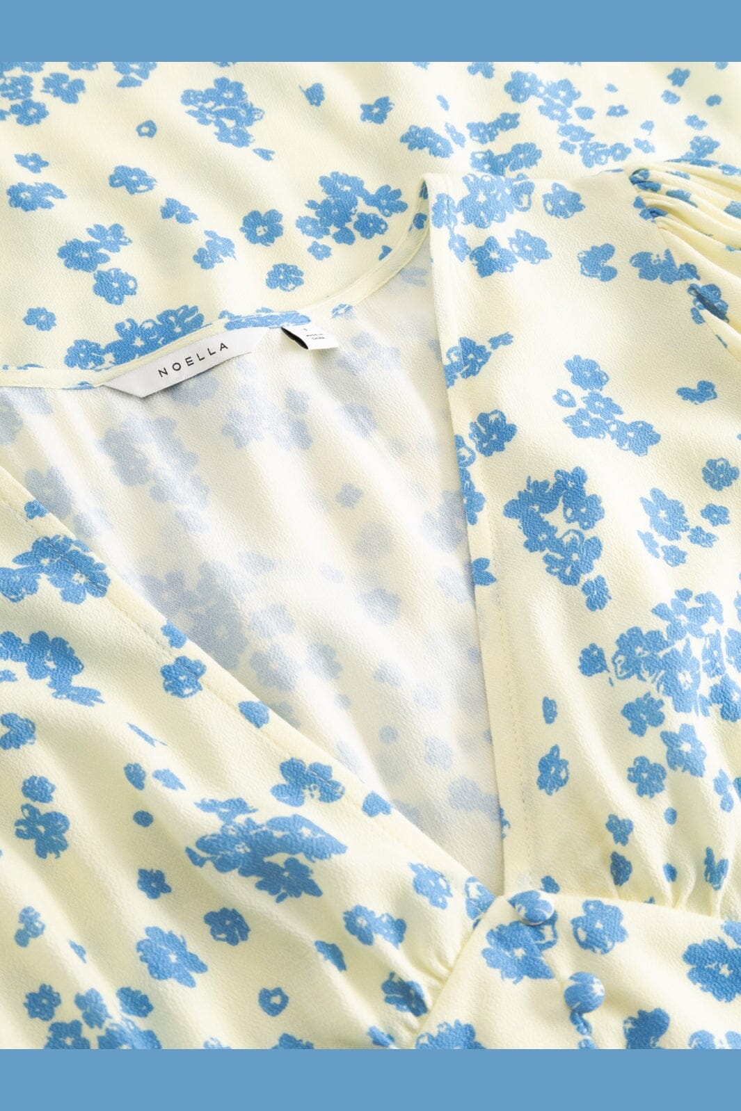 Sukienka Noella w żółtym kolorze z niebieskim kwiatowym wzorem. Sukienka ma głęboki dekolt w kształcie litery V oraz krótkie bufiaste rękawy z objętością.