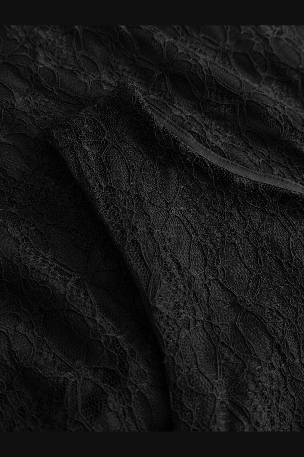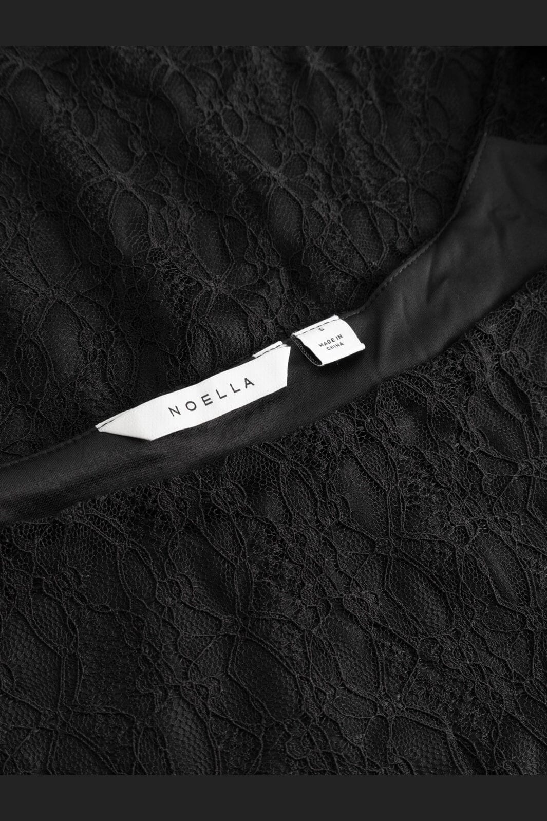 Czarna koronkowa sukienka od Noella. Sukienka pasuje na wesela, przyjęcia i formalne okazje dzięki fasonowi off-shoulder i asymetrycznemu krojowi.