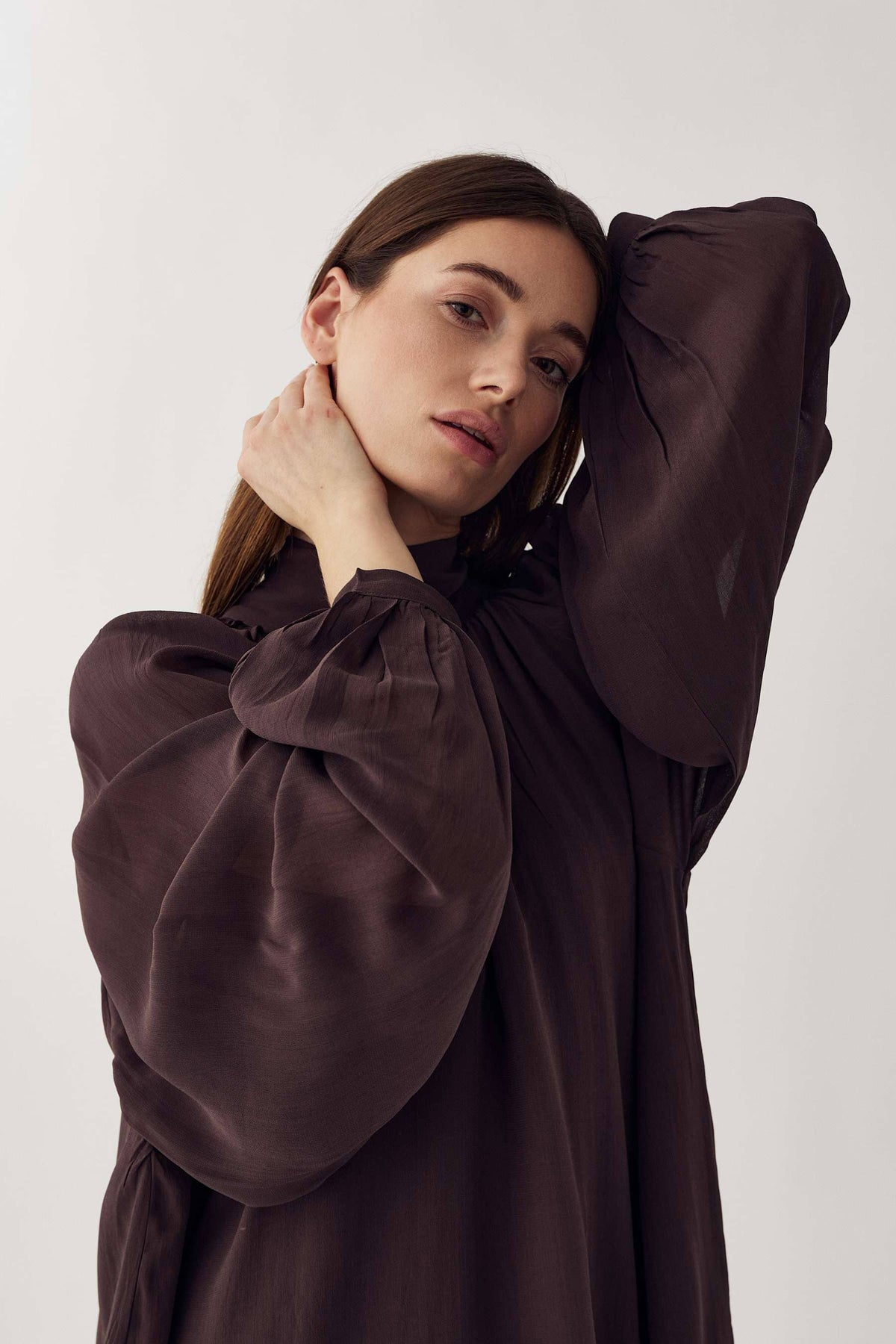 Czekoladowobrązowa sukienka marki Noella, wykonana w 100% z wiskozy. Sukienka ma wysoki dekolt z kokardą oraz długie rękawy z elastycznymi mankietami.