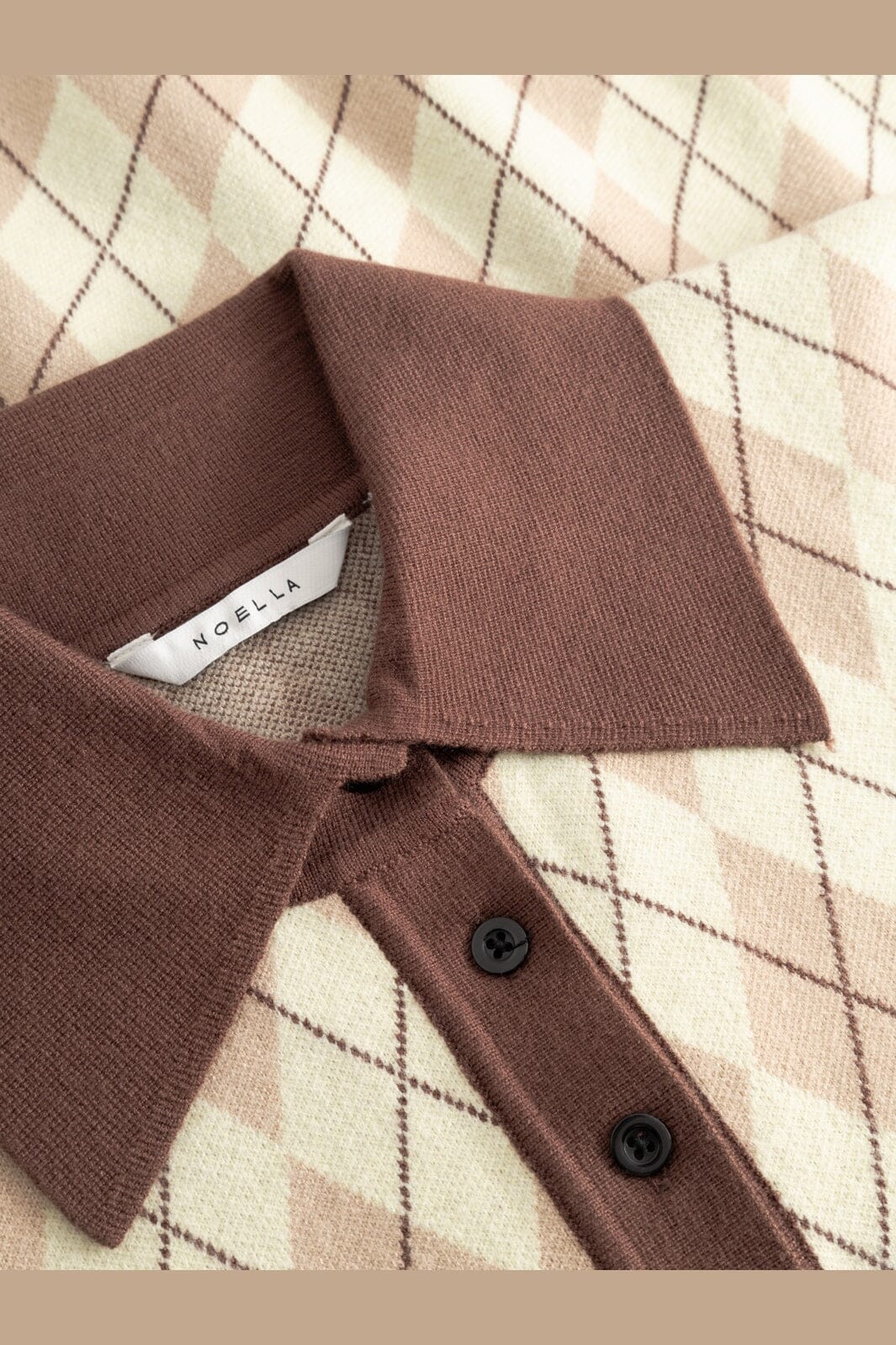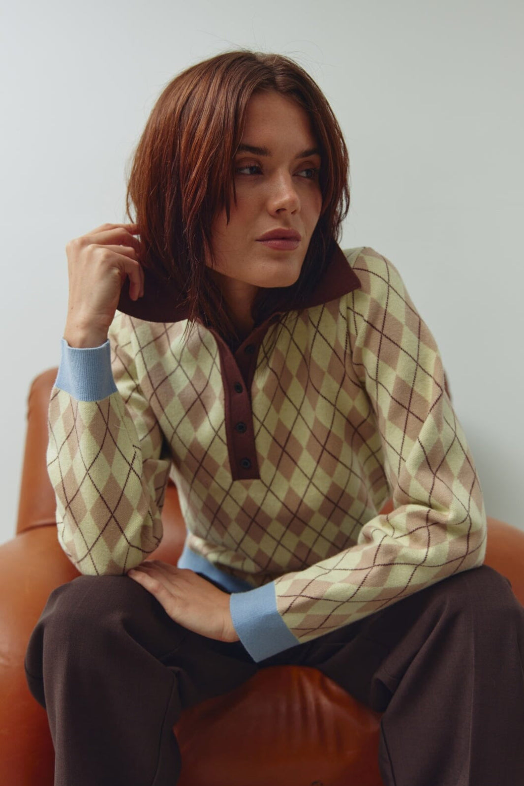 Sweter Noella z żółto-brązowej dzianiny w kratę typu intarsja. Sweter ma brązowy kołnierz polo, długie rękawy z jasnoniebieskimi mankietami oraz dopasowany krój slim fit.