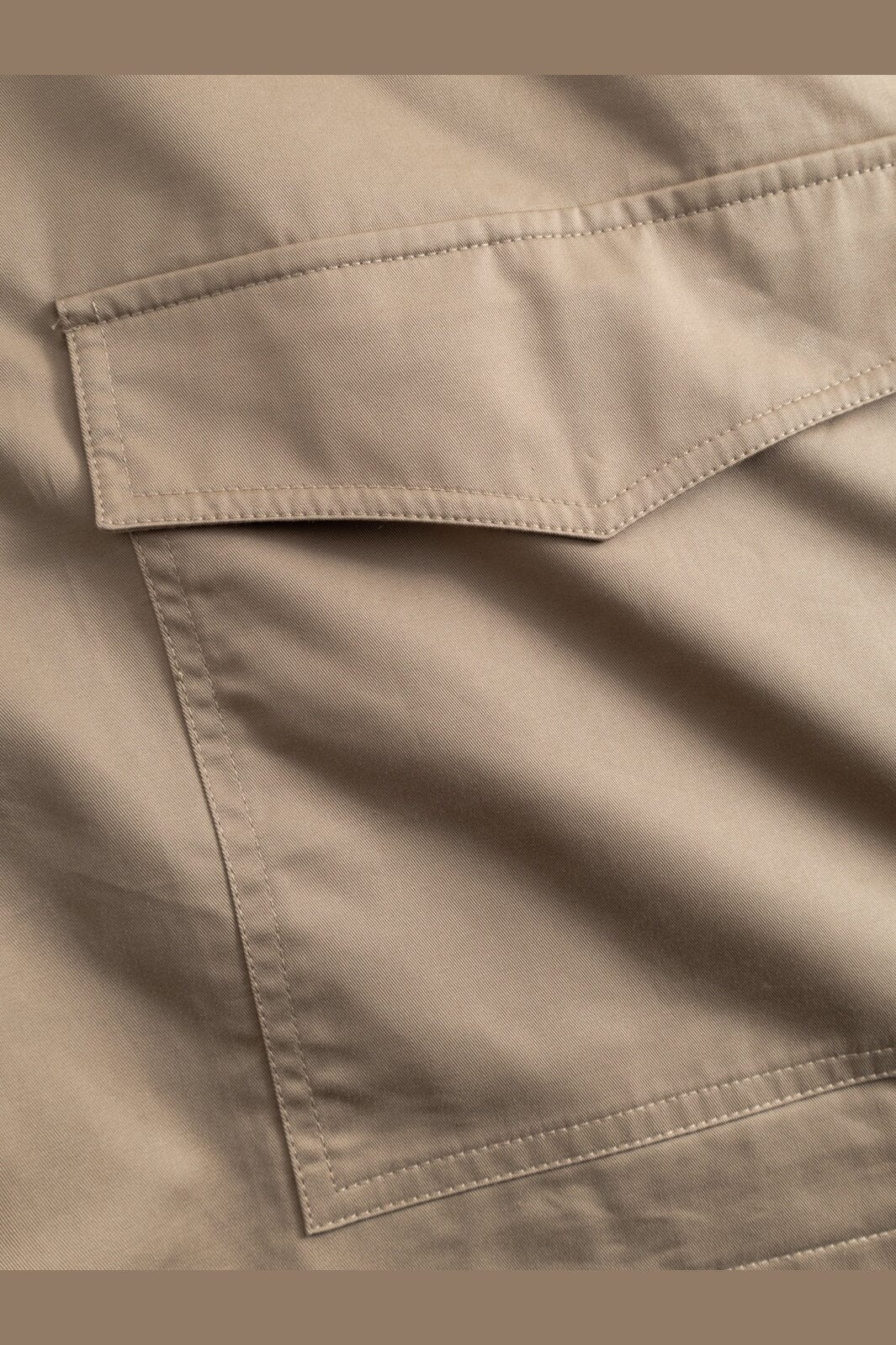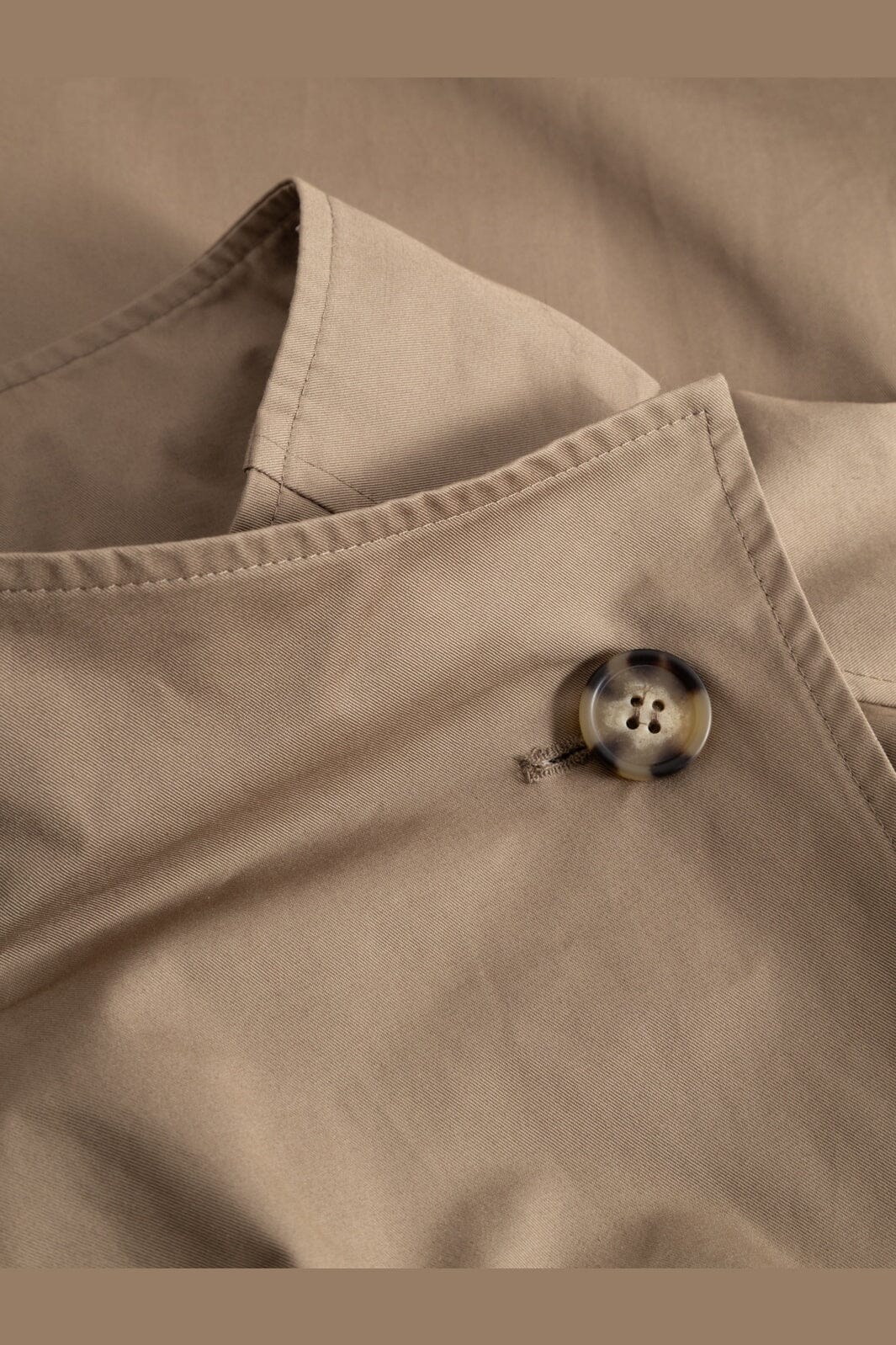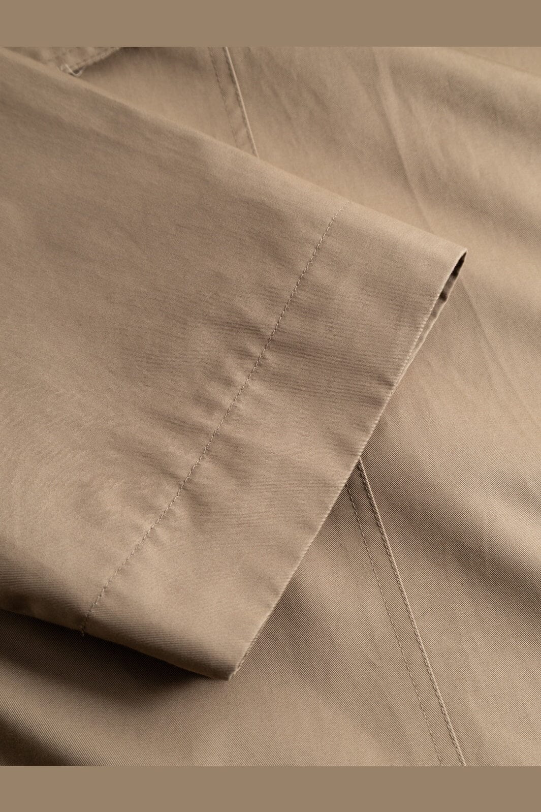 Szary, piaskowy płaszcz od Noella, wykonany w 100% z bawełny. Płaszcz ma długą, smukłą sylwetkę z oversize kieszeniami i paskiem w talii.