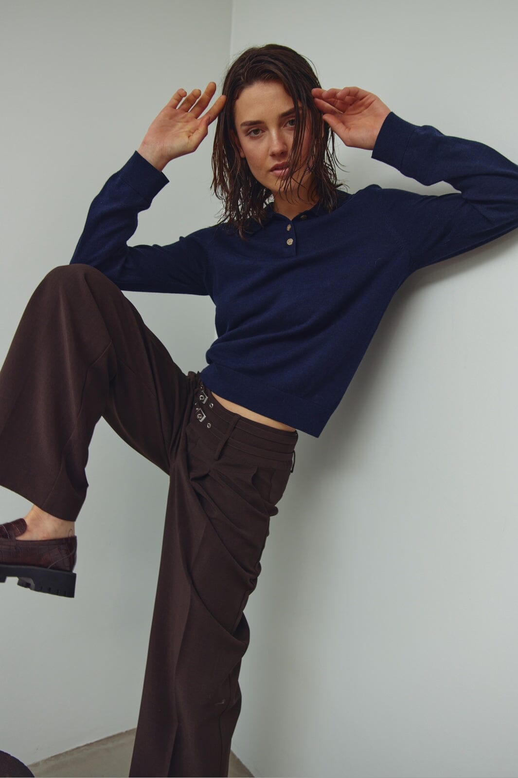 Sweter dzianinowy Noella w ciemnoniebieskim kolorze. Sweter ma klasyczny fason polo z zapięciem na guziki z przodu oraz dzianinową strukturę o swobodnym kroju.