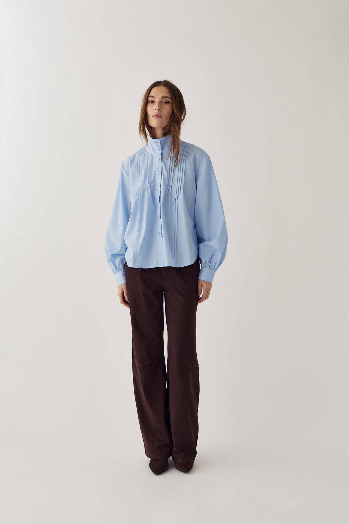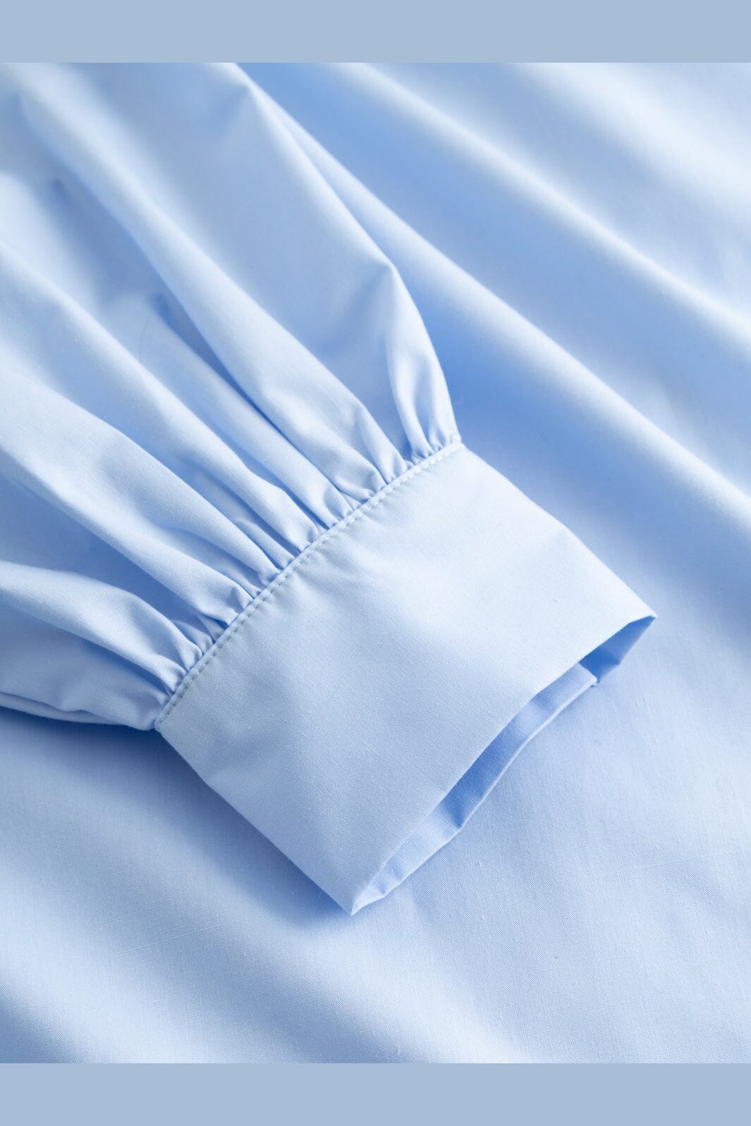 Jasnoniebieska bluzka od Noella, wykonana w 80% z poliestru i w 20% z bawełny. Bluzka ma wysoki dekolt oraz detale typu pintuck na wysokości biustu.