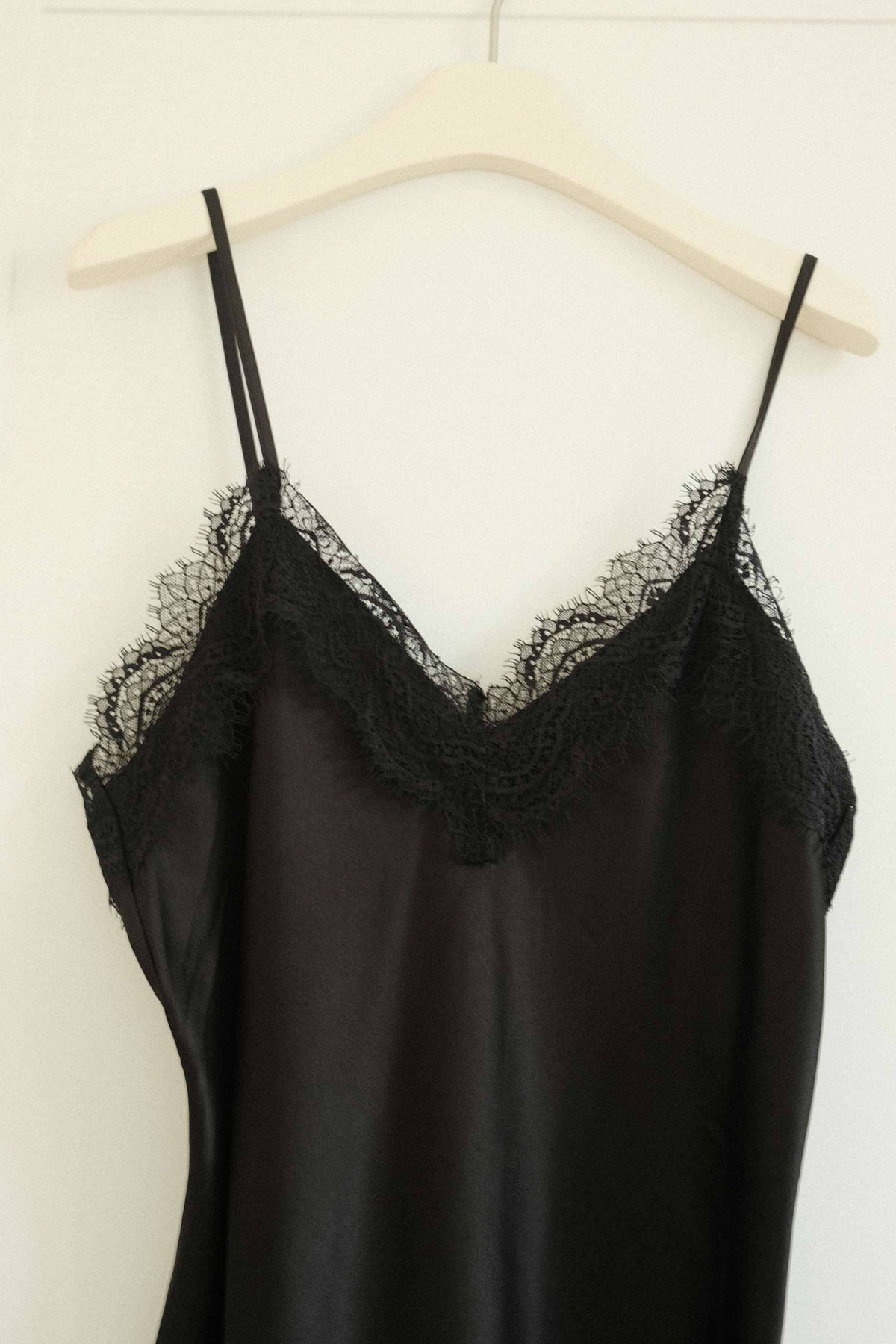 Czarna satynowa sukienka od Noella. Sukienka ma cienkie, regulowane ramiączka, koronkowe detale oraz asymetryczny dół sięgający do kolana.