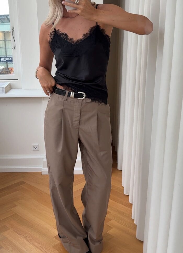 Czarna satynowa bluzka Noella z dekoltem w serek i koronkowymi detalami wzdłuż dekoltu i brzegu. Bluzka ma cienkie ramiączka i asymetryczny dół.