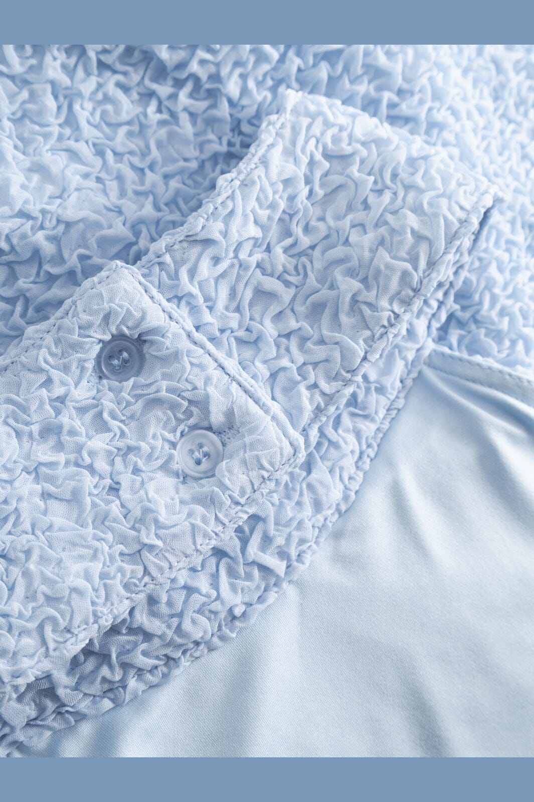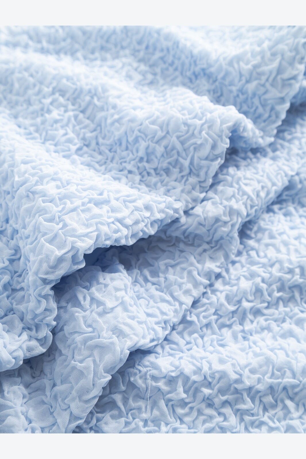 Jasnoniebieski top marki Noella, wykonany w 95% z poliestru i w 5% z elastanu. Tkanina ma pogniecioną fakturę, która nadaje topowi głębi.