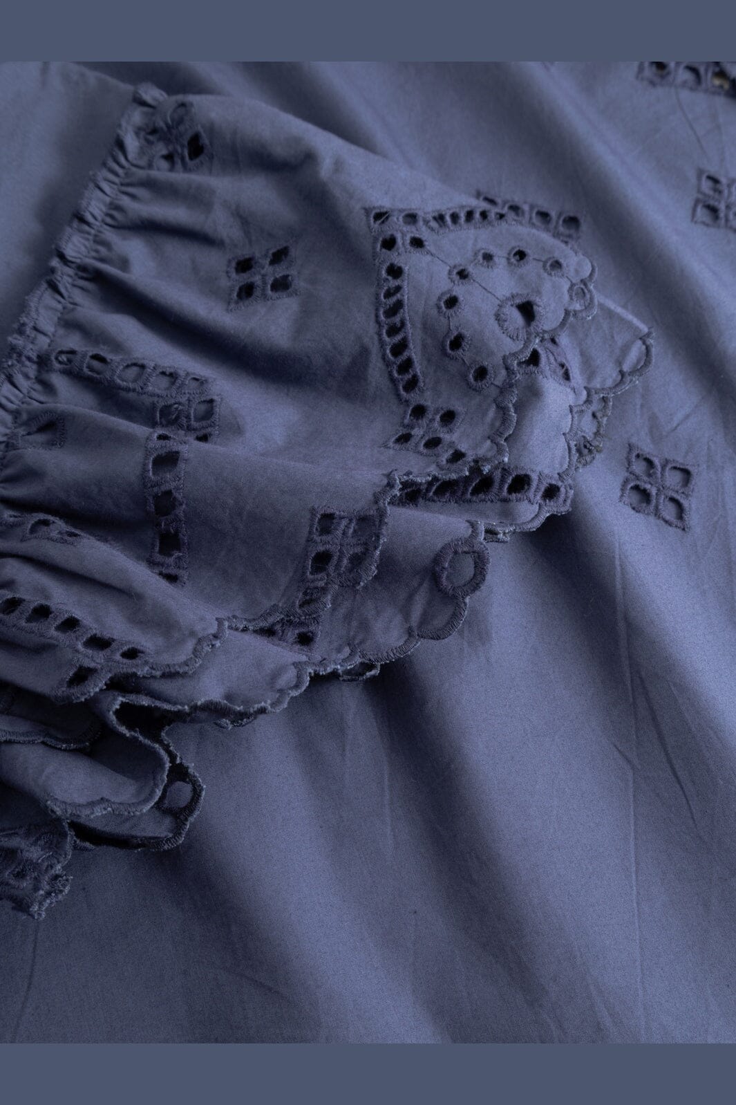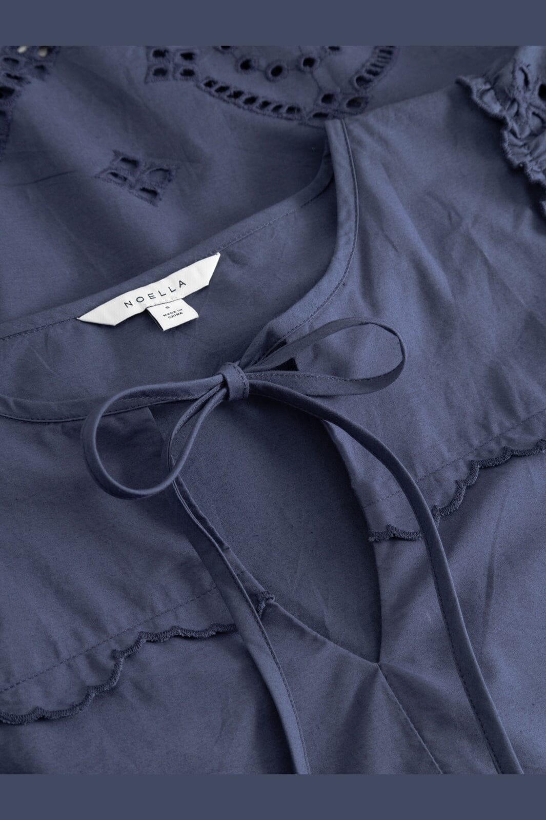 Sukienka Noella w przygaszonym niebieskim kolorze. Wykonana w 100% z bawełny z haftowanymi detalami, wiązaniem i koronką.