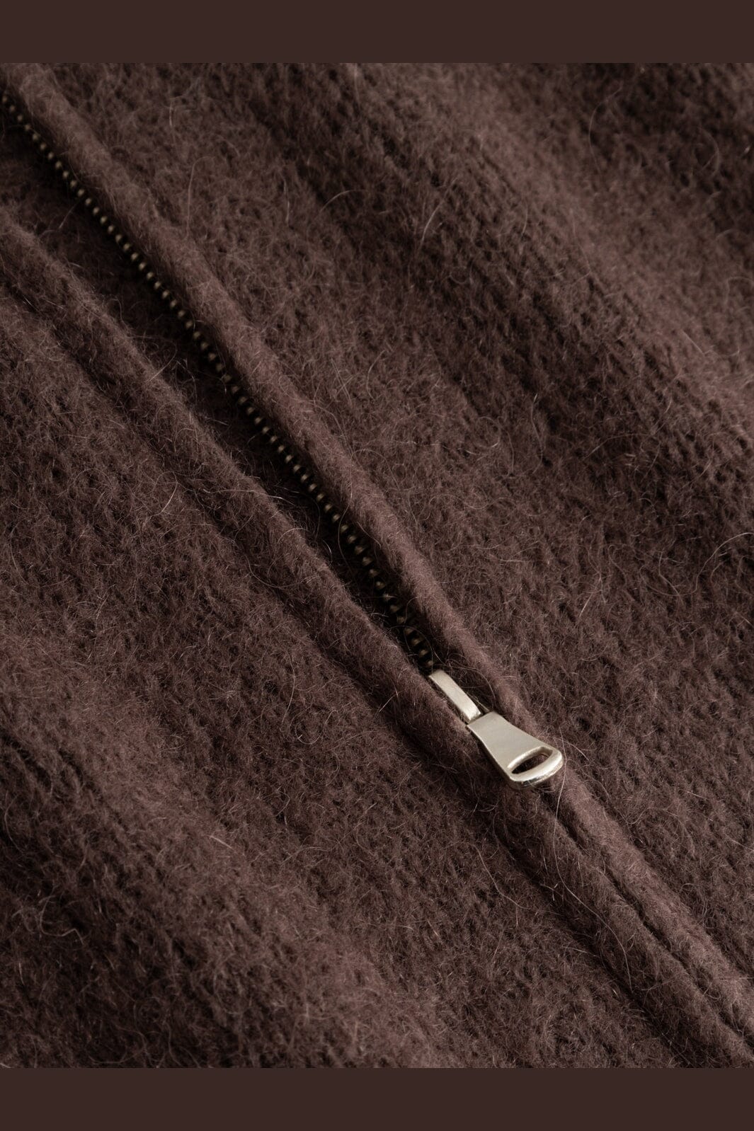 Dziany kardigan od Noella w czekoladowym brązie. Ma kaptur, zamek błyskawiczny z przodu oraz troczek do wiązania.