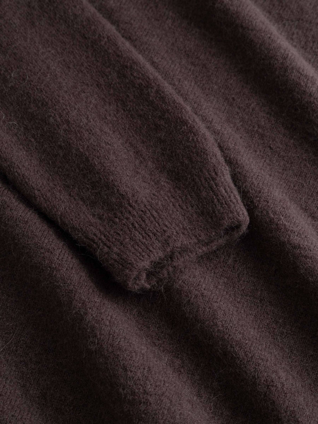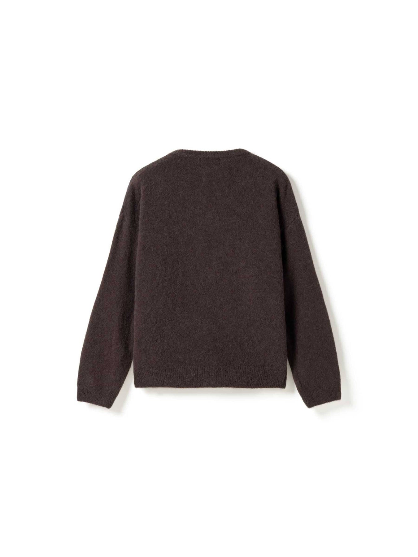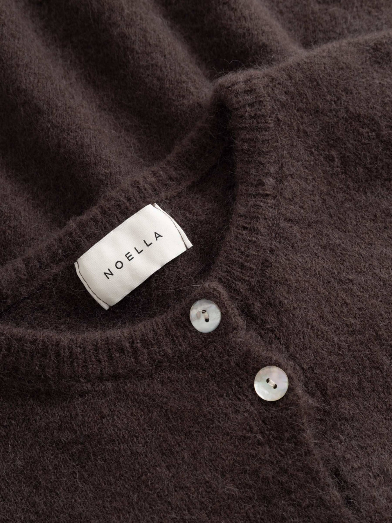 Dziany kardigan Noella w kolorze czekoladowego brązu. Kardigan ma luźny krój, zapięcie na guziki z przodu oraz okrągły dekolt z długimi rękawami.