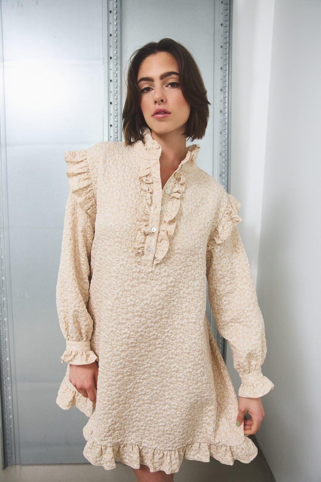 Sukienka od Noella w jasnym kolorze ostrygowym z kwiatowym wzorem. Ma wysoki dekolt z falbanami, guziki z przodu i długie rękawy z falbanami. Sukienka kończy się falbaną na dole.