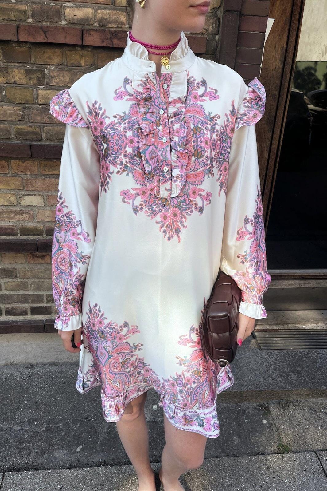 Krótka sukienka od Noella z kwiatowym nadrukiem w jasnych i ciemnych odcieniach. Sukienka ma wysoki kołnierz z falbankami, długie rękawy i guziki z przodu. Wzór łączy różowy i niebieski na jasnym tle.