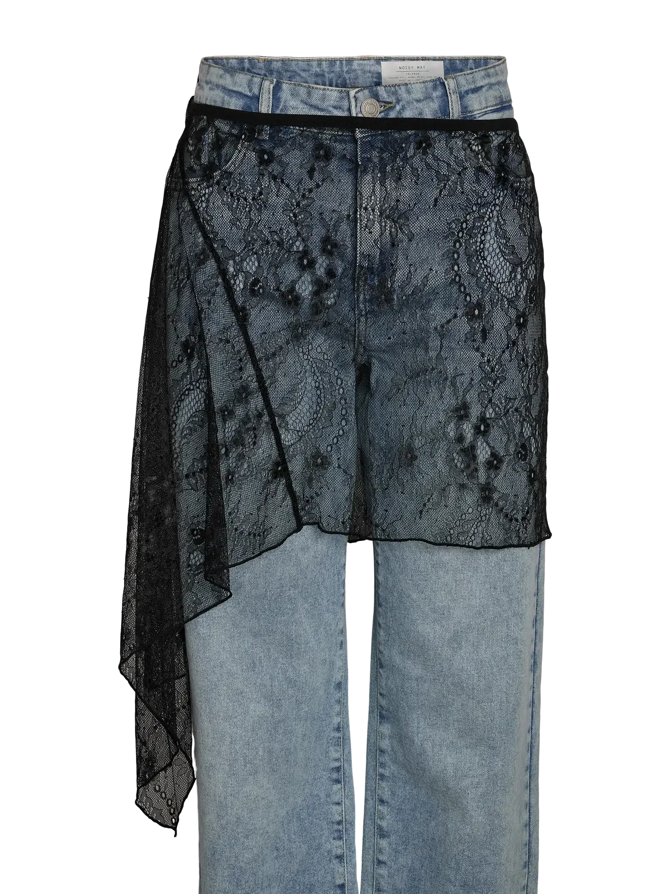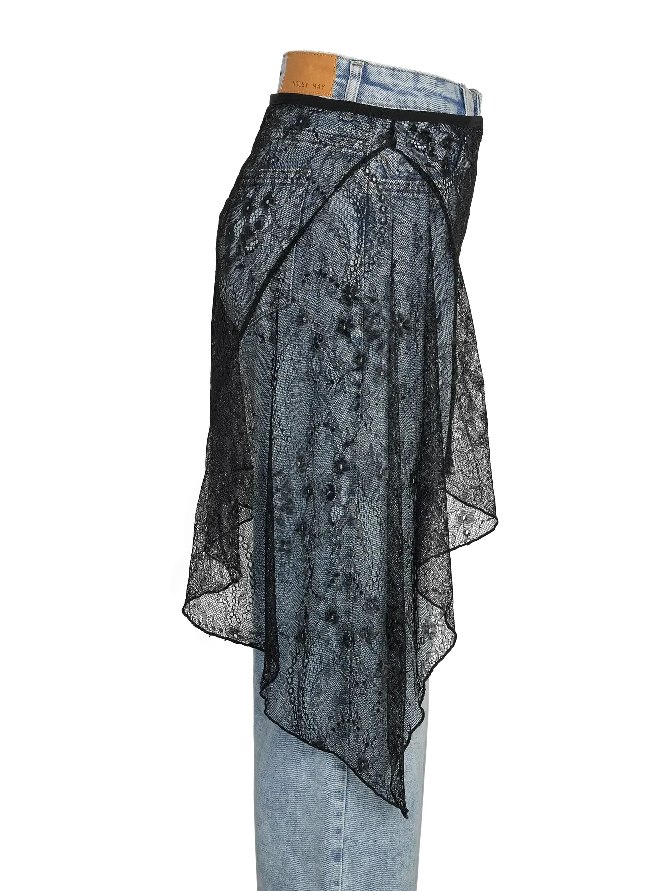 Czarna koronkowa spódnica marki Noisy May, zaprojektowana do noszenia na dżinsy lub spodnie. Spódnica ma kwiatowy wzór z koronki i asymetryczny dół.