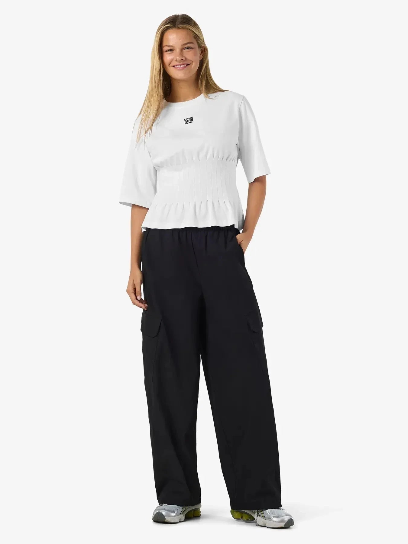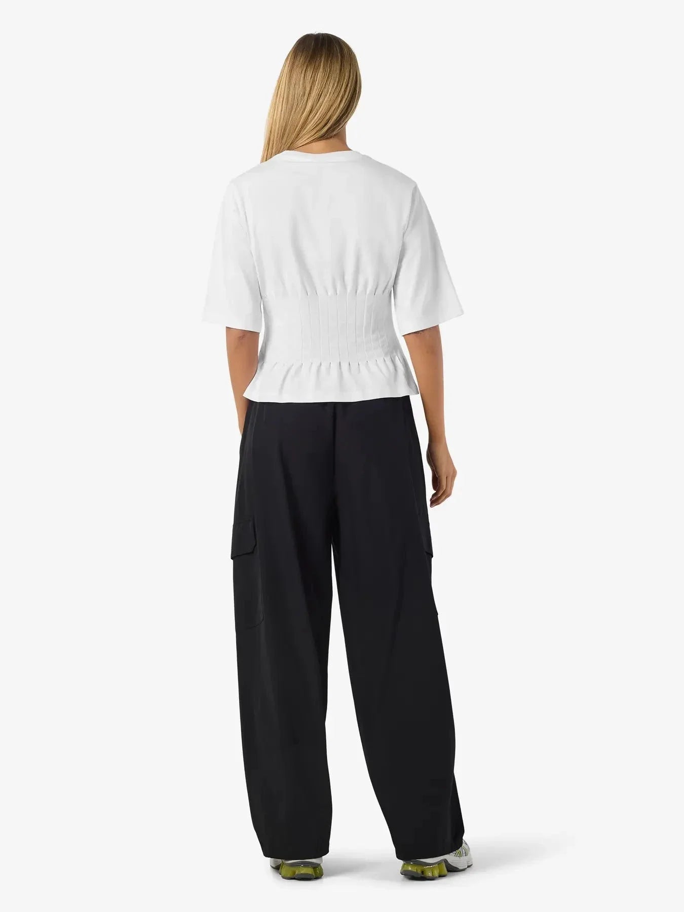 Biała dopasowana koszulka T-shirt od Noisy May z logo na piersi. Koszulka ma szew w talii z falbankami.