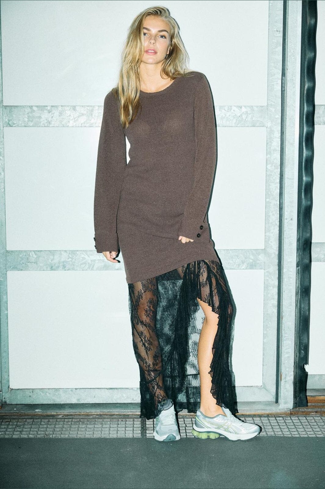Długa spódnica Noisy May w kolorze czarnym z przezroczystą, koronkową powierzchnią. Kwiatowy wzór koronki nadaje spódnicy kobiecy charakter.