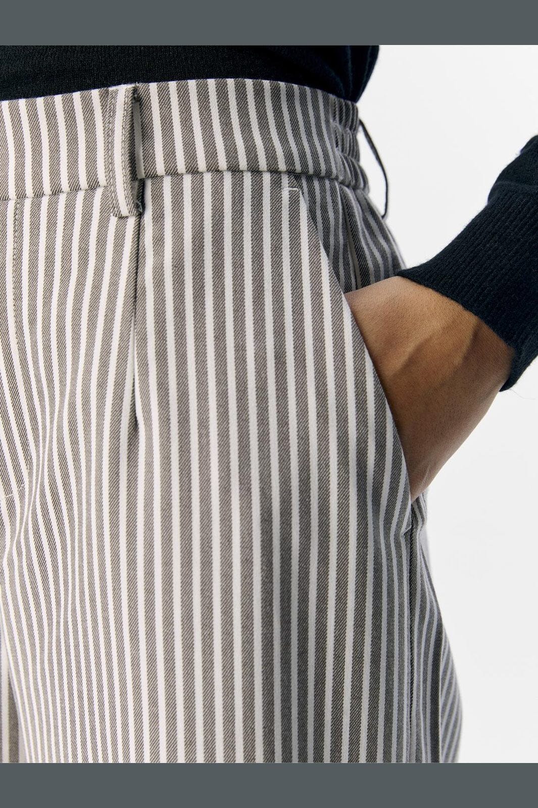 Spodnie w paski od Object z szerokimi nogawkami i fałdą z przodu. Jasne paski na brązowym tle tworzą klasyczny wygląd, podczas gdy luźny krój zapewnia dużą swobodę ruchów.
