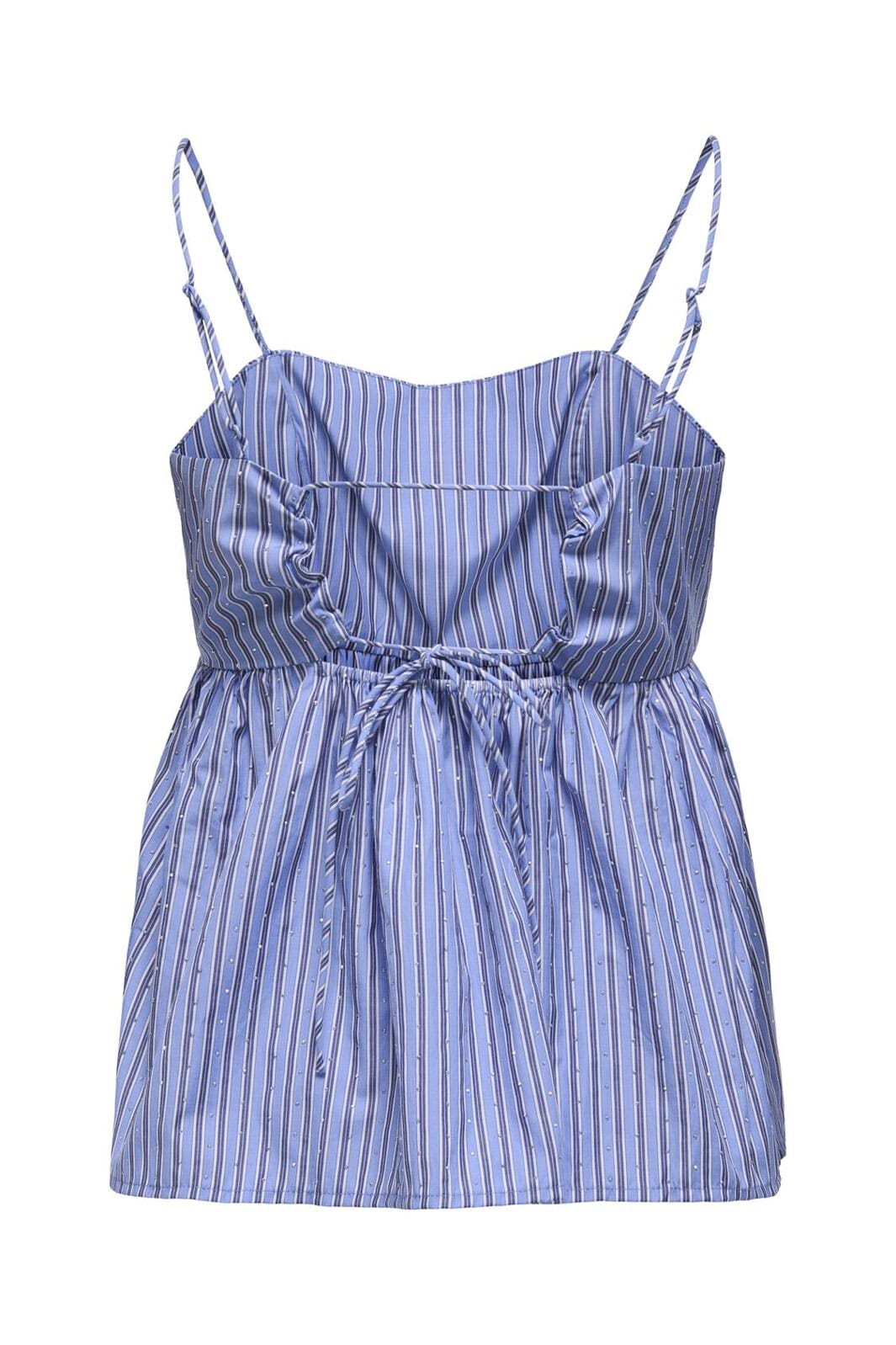 Pasujący top od Only z cienkimi ramiączkami i detalami z kryształków. Jasnoniebieski i biały top ma kwadratowy dekolt i wiązanie w talii. Materiał ma morski charakter z paskami.