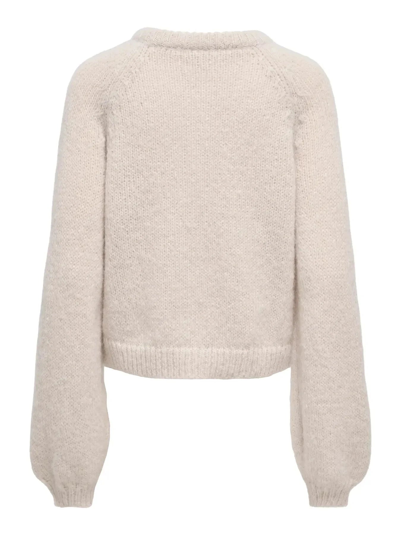 Kardigan marki Only w jasnobeżowym kolorze. Kardigan wykonany jest w 100% z poliestru z recyklingu i ma długie rękawy raglanowe oraz zapięcie na guziki z przodu.