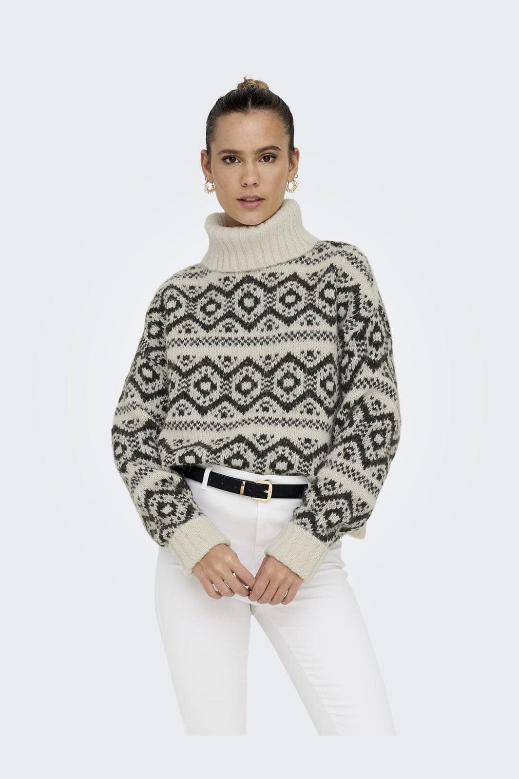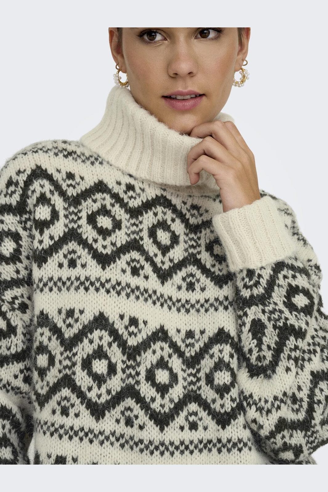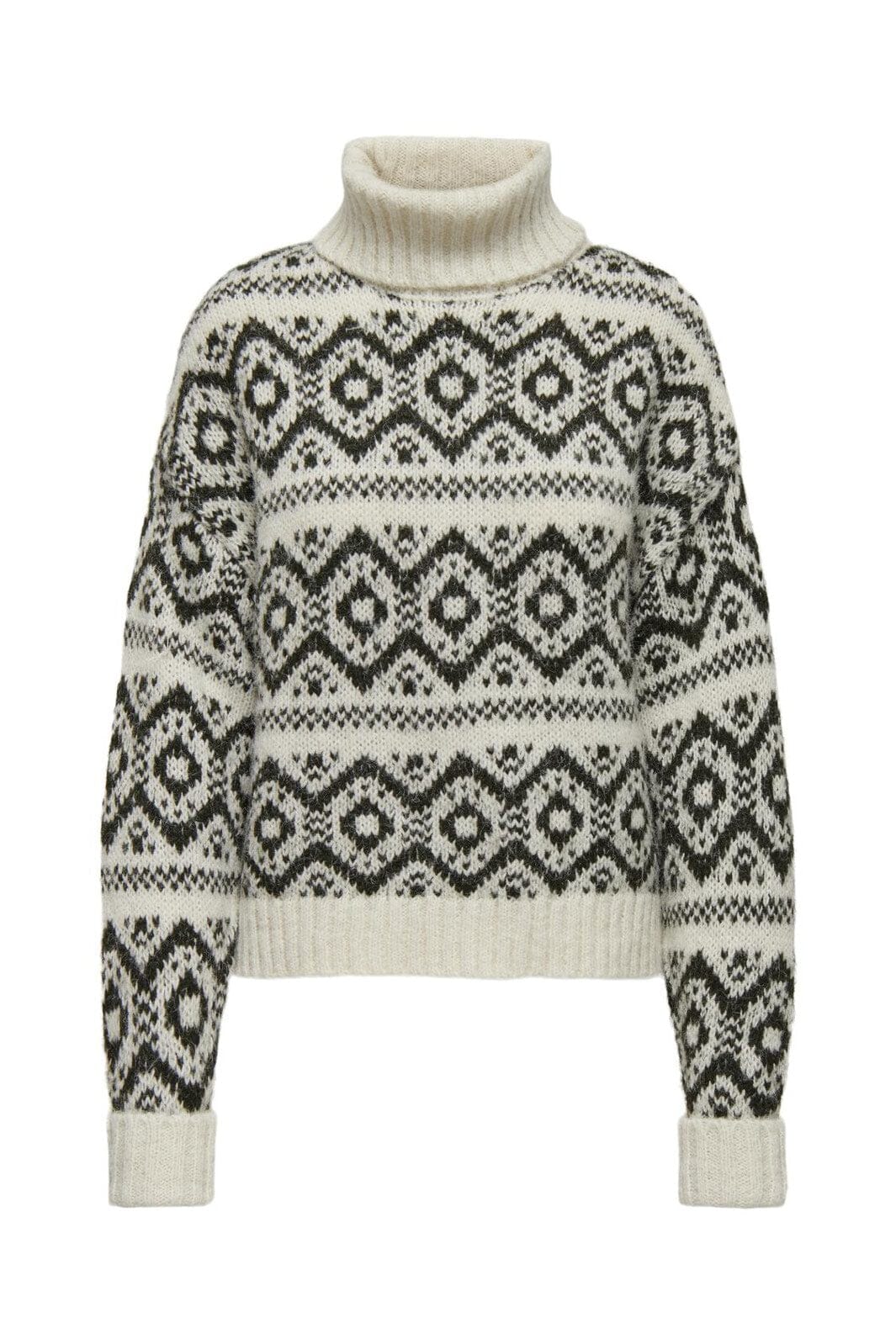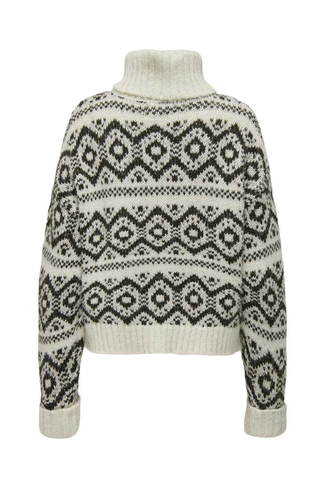Sweter od Only z geometrycznym wzorem w odcieniach brzozy i żywicy. Wysoki golf i luźny krój zapewniają dobrą kombinację stylu i komfortu.