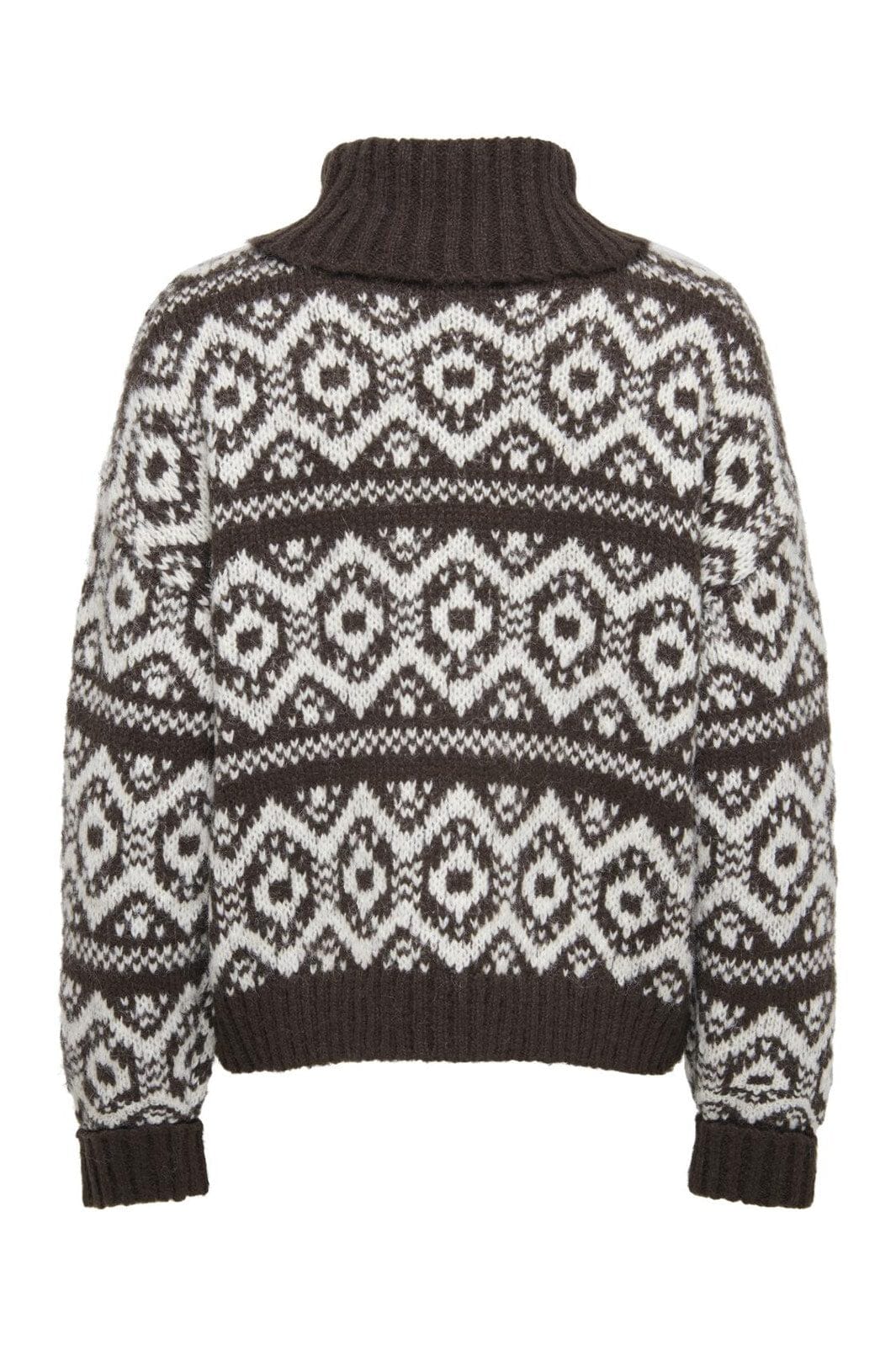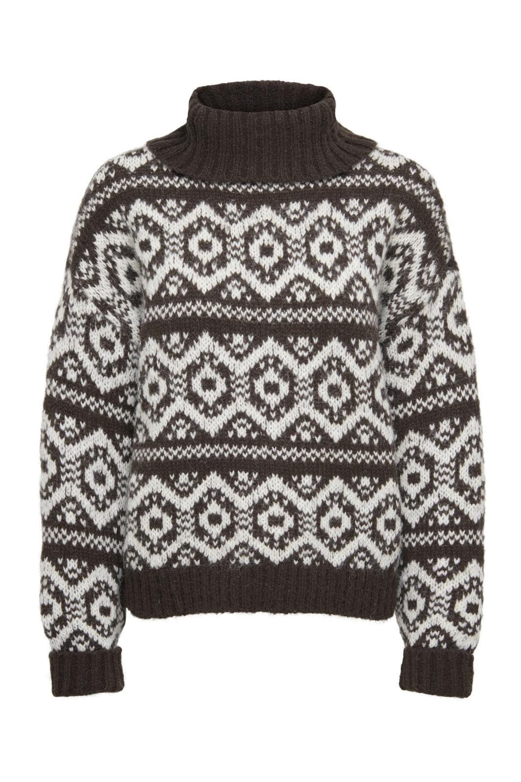 Sweter od Only w ciemnym brązie z białym geometrycznym wzorem. Ma luźny krój z obniżonymi ramionami i wysokim golfem, który zapewnia ciepło w chłodne dni.