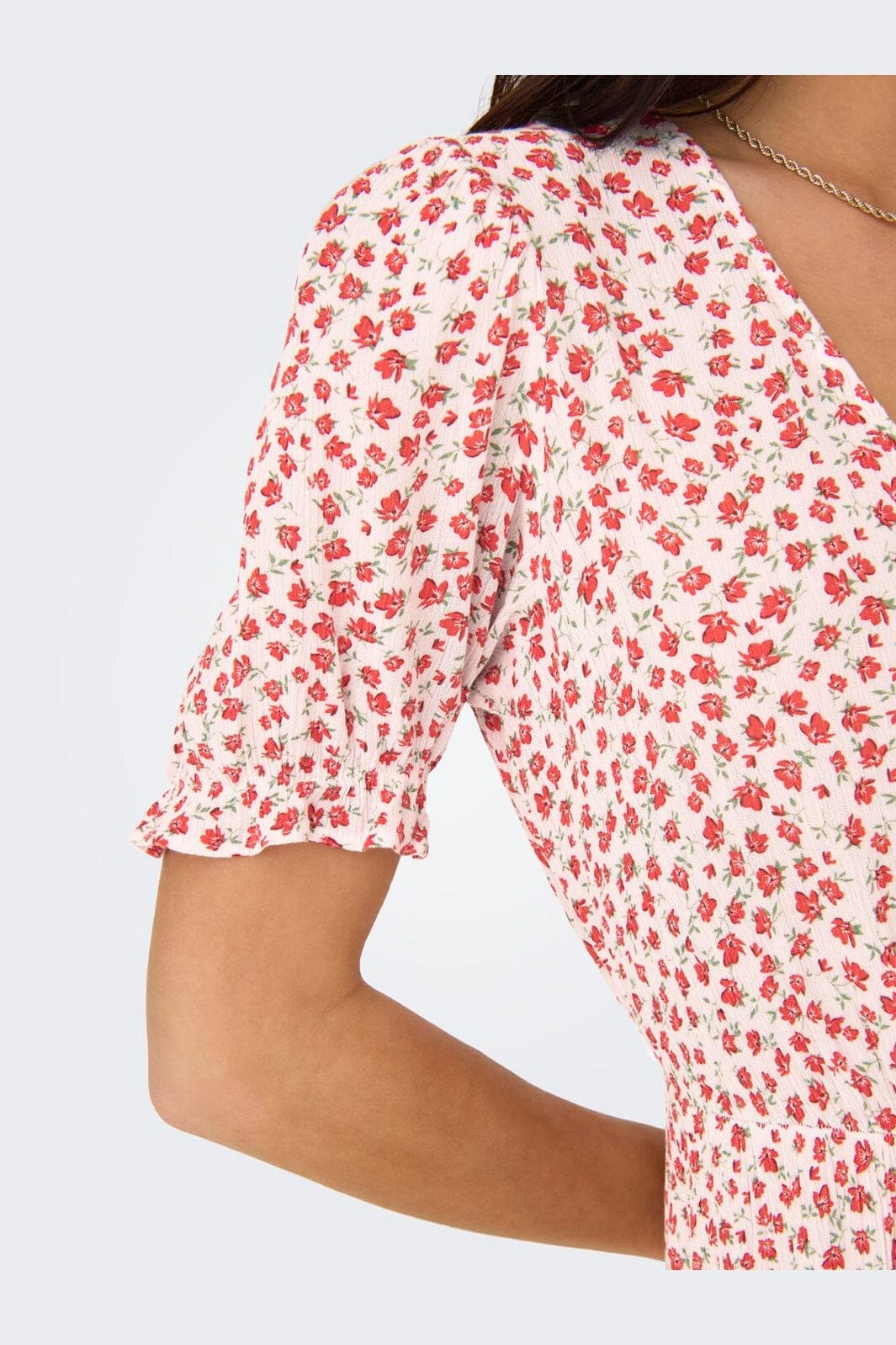 Długa sukienka marki Only z 100% wiskozy Lenzing™ Ecovero™. Sukienka ma czerwony kwiatowy wzór na białym tle.