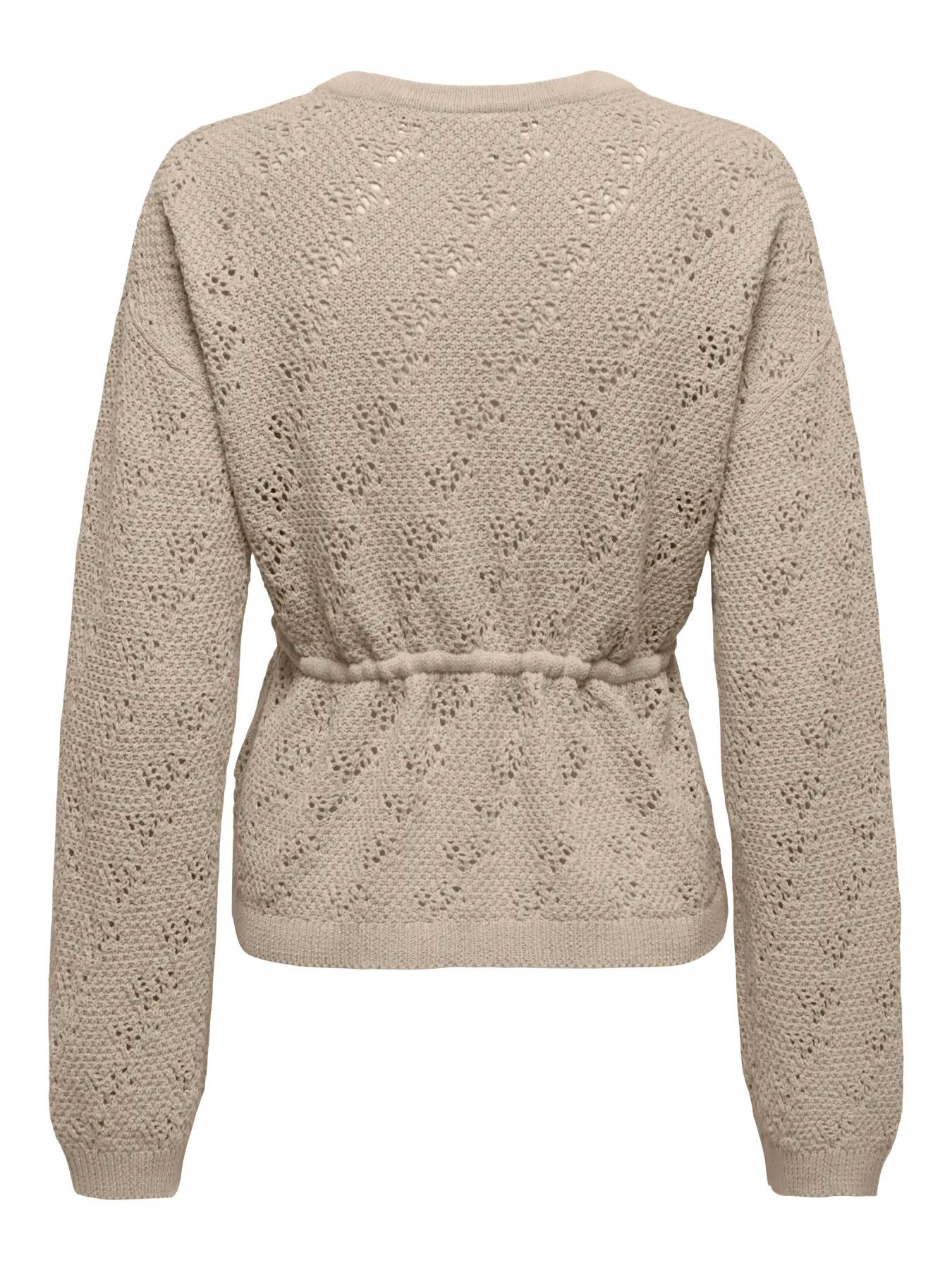 Beżowy kardigan marki Only z guzikami w kształcie serca w srebrnym kolorze. Kardigan wykonany jest w 70% z bawełny z recyklingu i w 30% z poliestru z recyklingu, w ażurowej, otwartej strukturze dzianiny.