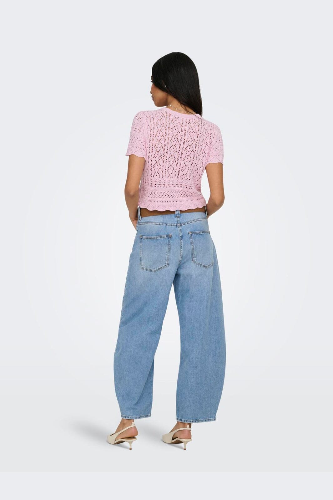 Różowy kardigan marki Only z koronką i perełkowymi detalami. Kardigan ma krótkie rękawy, zapięcie na guziki oraz krótką, cropped sylwetkę z szwami wykończonymi falistym scallop brzegiem.