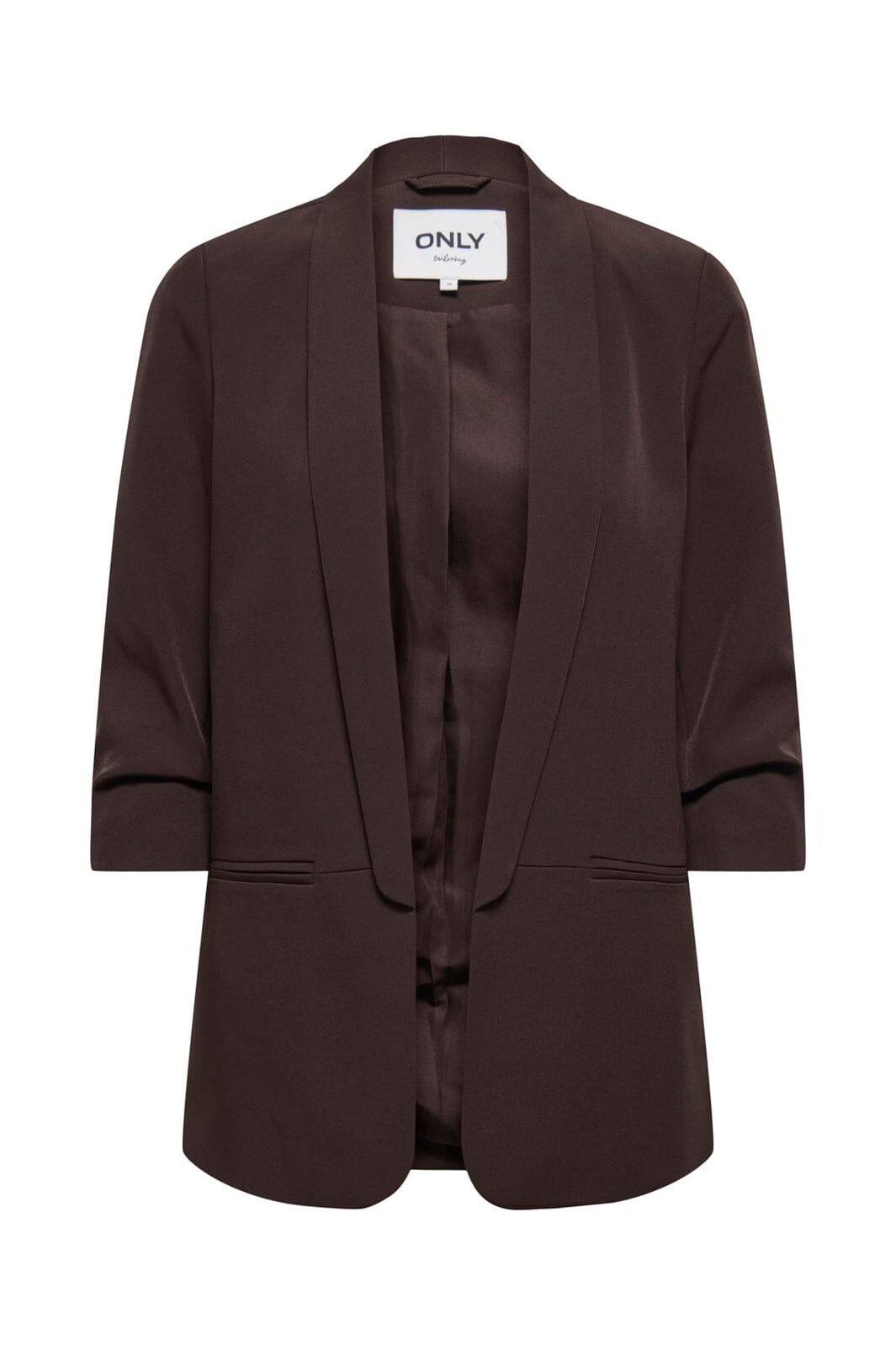 Brązowy blazer od Only z rękawami o długości trzech czwartych i kołnierzykiem. Otwarta przód bez guzików i dwie przednie kieszenie nadają blazerowi czysty i prosty wyraz.