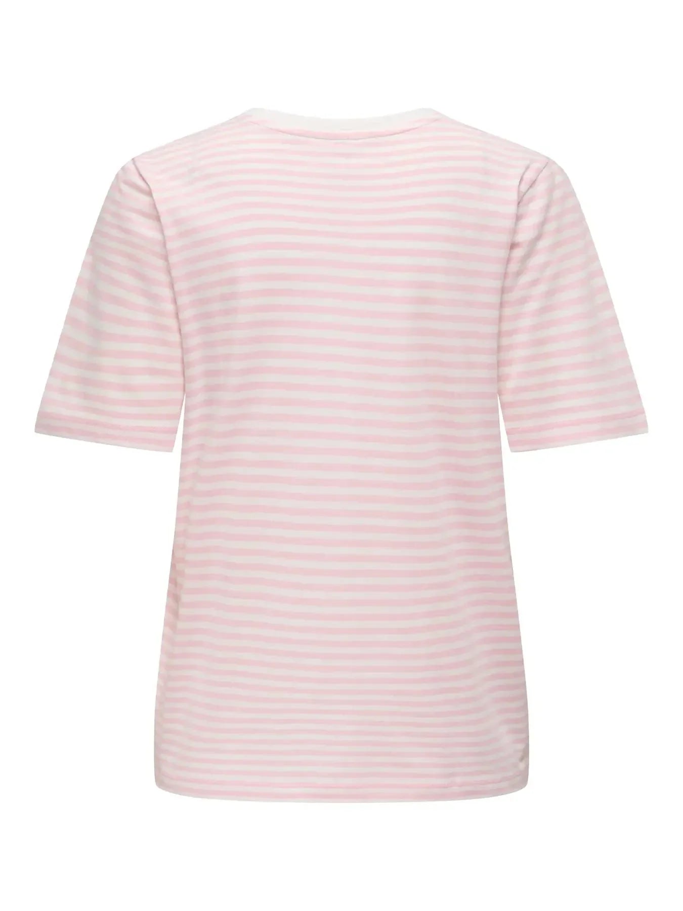 Pasiasty T-shirt od Only w różowym i białym kolorze. Wykonany w 100% z bawełny organicznej z małym haftem wiśni na piersi.