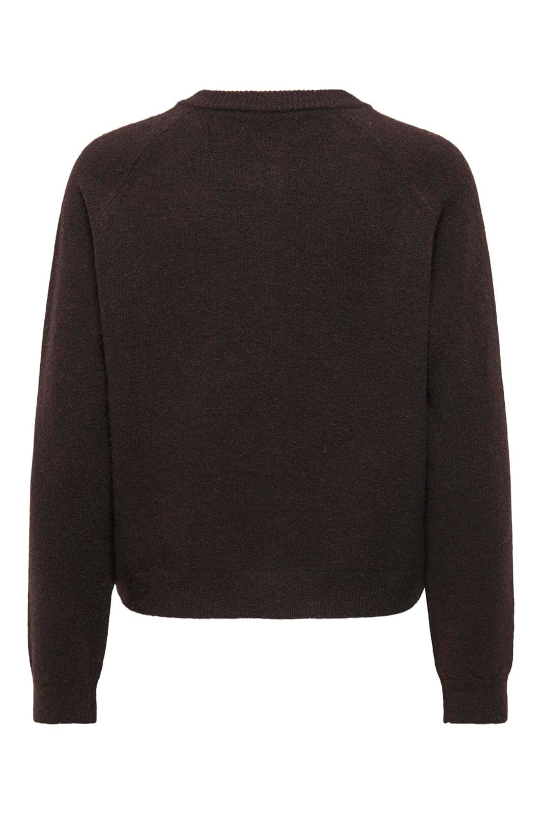 Ciemnobrązowy kardigan od Only z złotymi kokardkowymi guzikami z przodu. Kardigan ma długie rękawy, okrągły dekolt i regular fit.