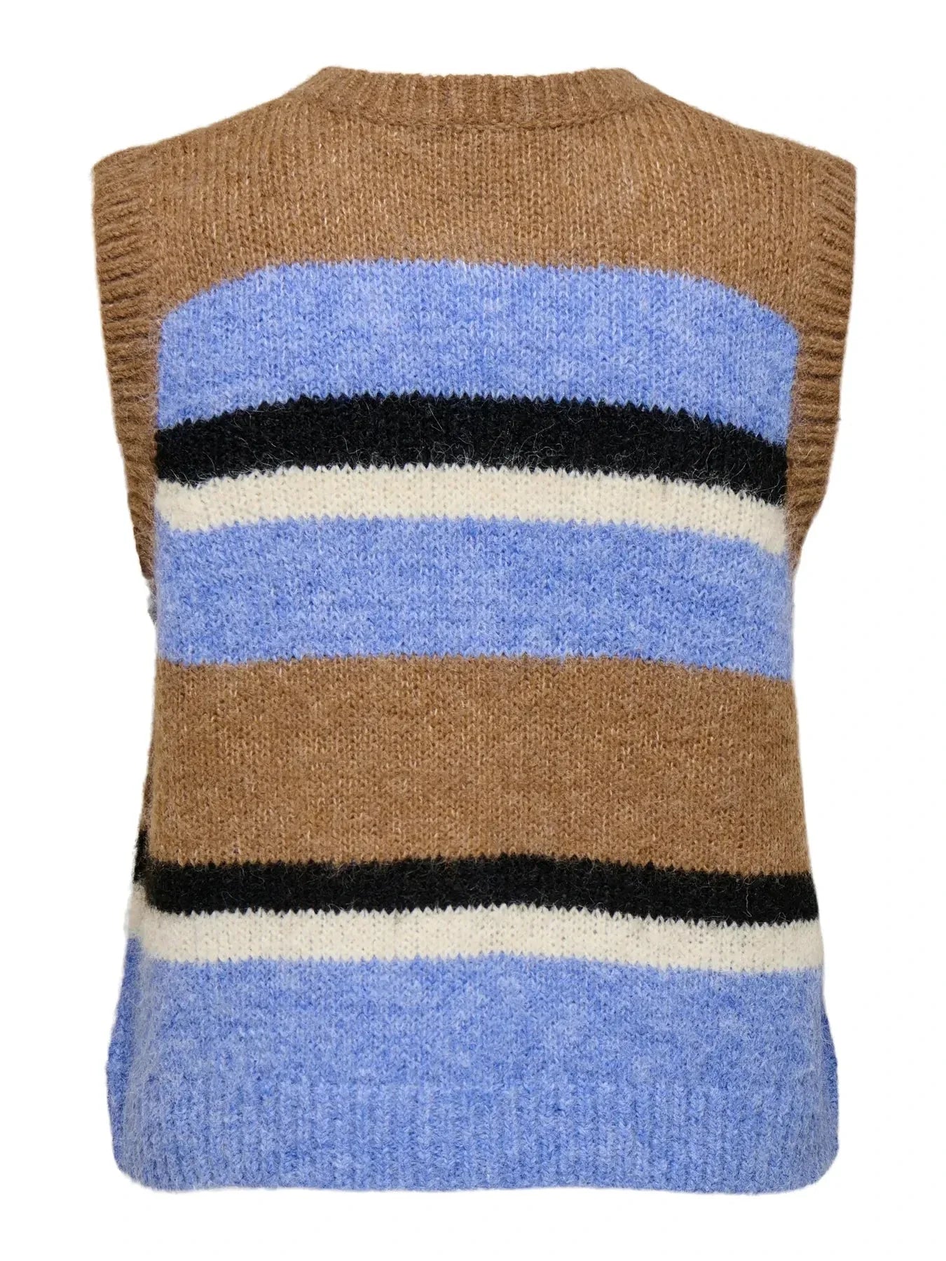 Stripowana kamizelka od Only z szerokimi poziomymi paskami w kolorze brązowym, jasnoniebieskim, czarnym i białym. Kamizelka ma czarne guziki i okrągły dekolt.