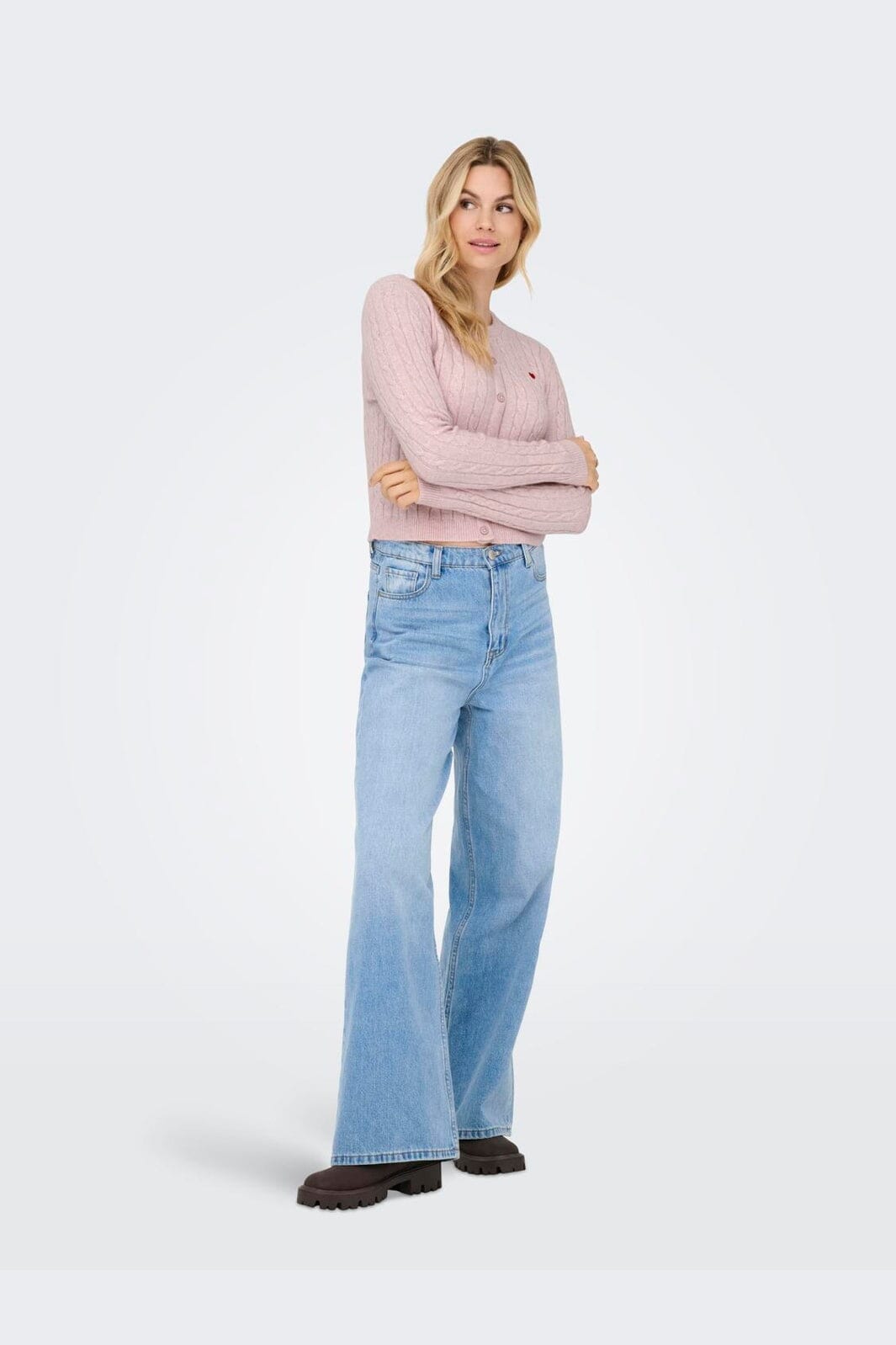 Jasnofioletowy kardigan od Only z wzorem w warkocze i małym czerwonym haftem serca na piersi. Kardigan ma zapięcie na guziki i ściągacze na mankietach.