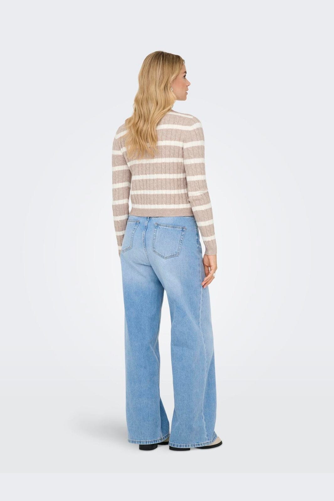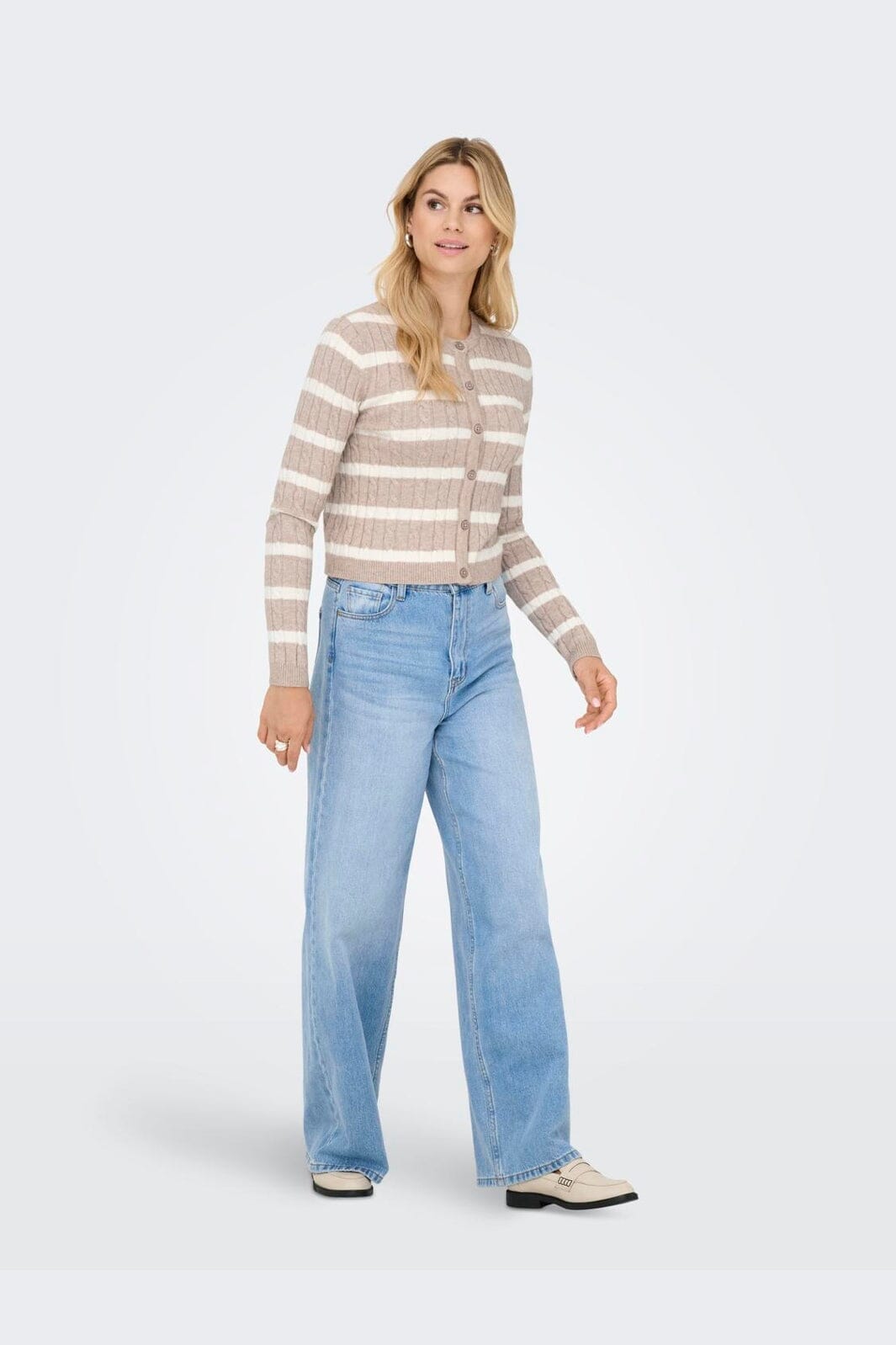 Stripowany kardigan od Only z wzorem w warkocz w beżowych i kremowych odcieniach. Kardigan ma zapięcie na guziki i długie rękawy z ściągaczami.