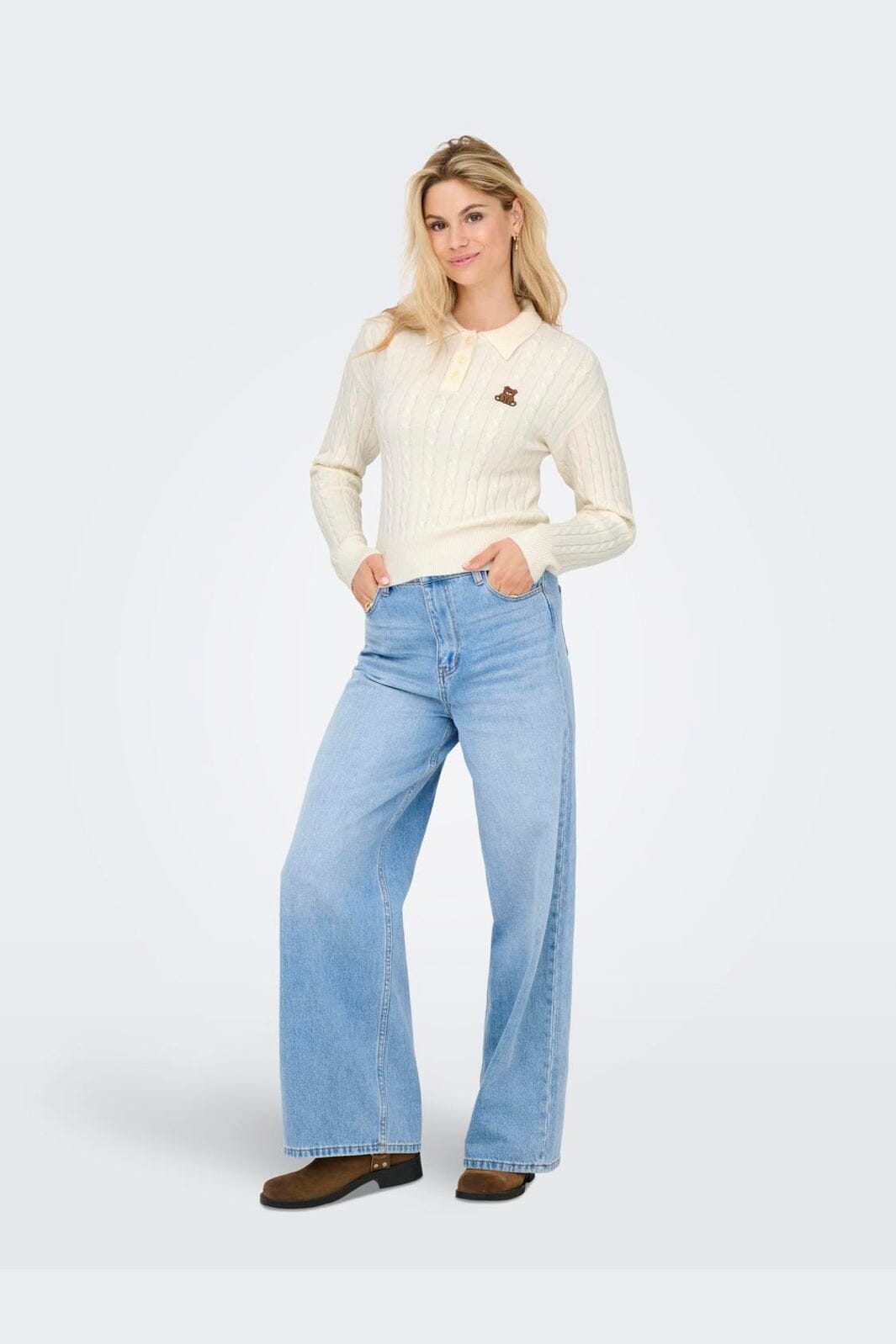 Sweter polo od Only w jasnym odcieniu kremowym. Sweter ma wzór w warkocze i haftowane motyw misia na piersi.