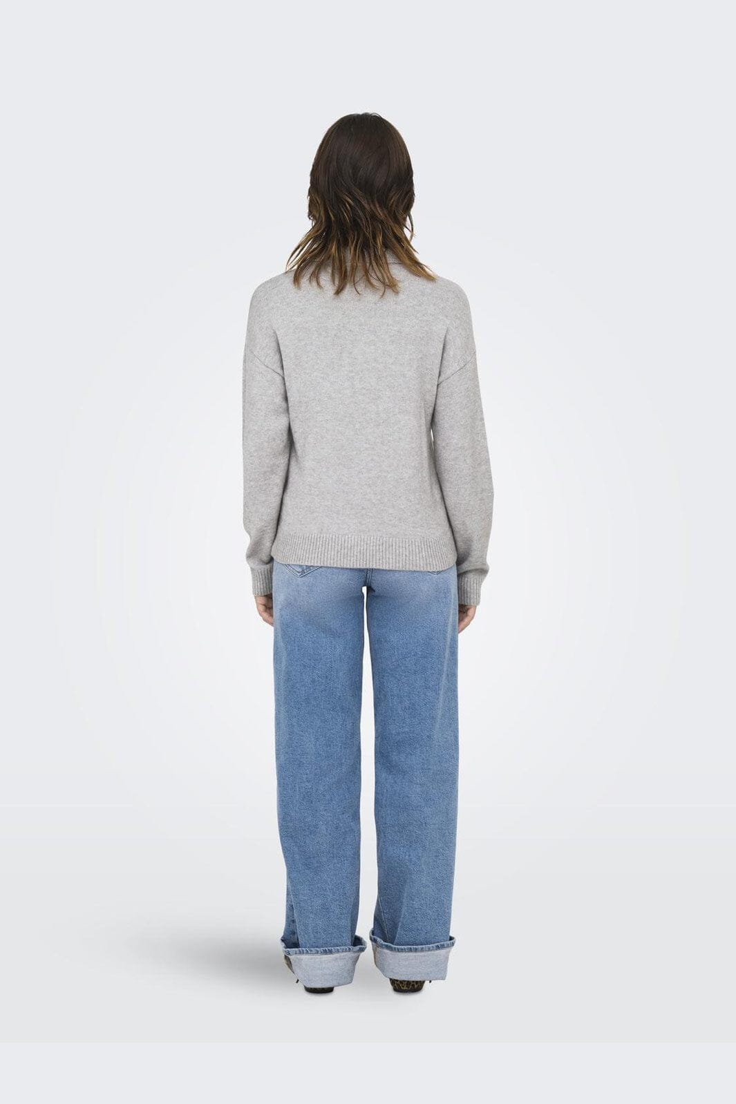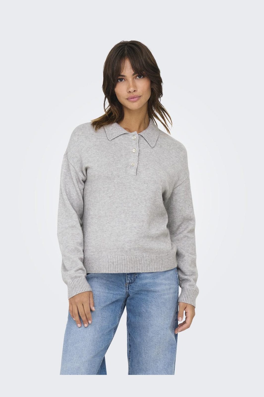 Jasnoszary sweter dzianinowy od Only z kołnierzykiem polo i zapięciem na guziki. Ma długie rękawy z mankietami i ściągacz na dole.