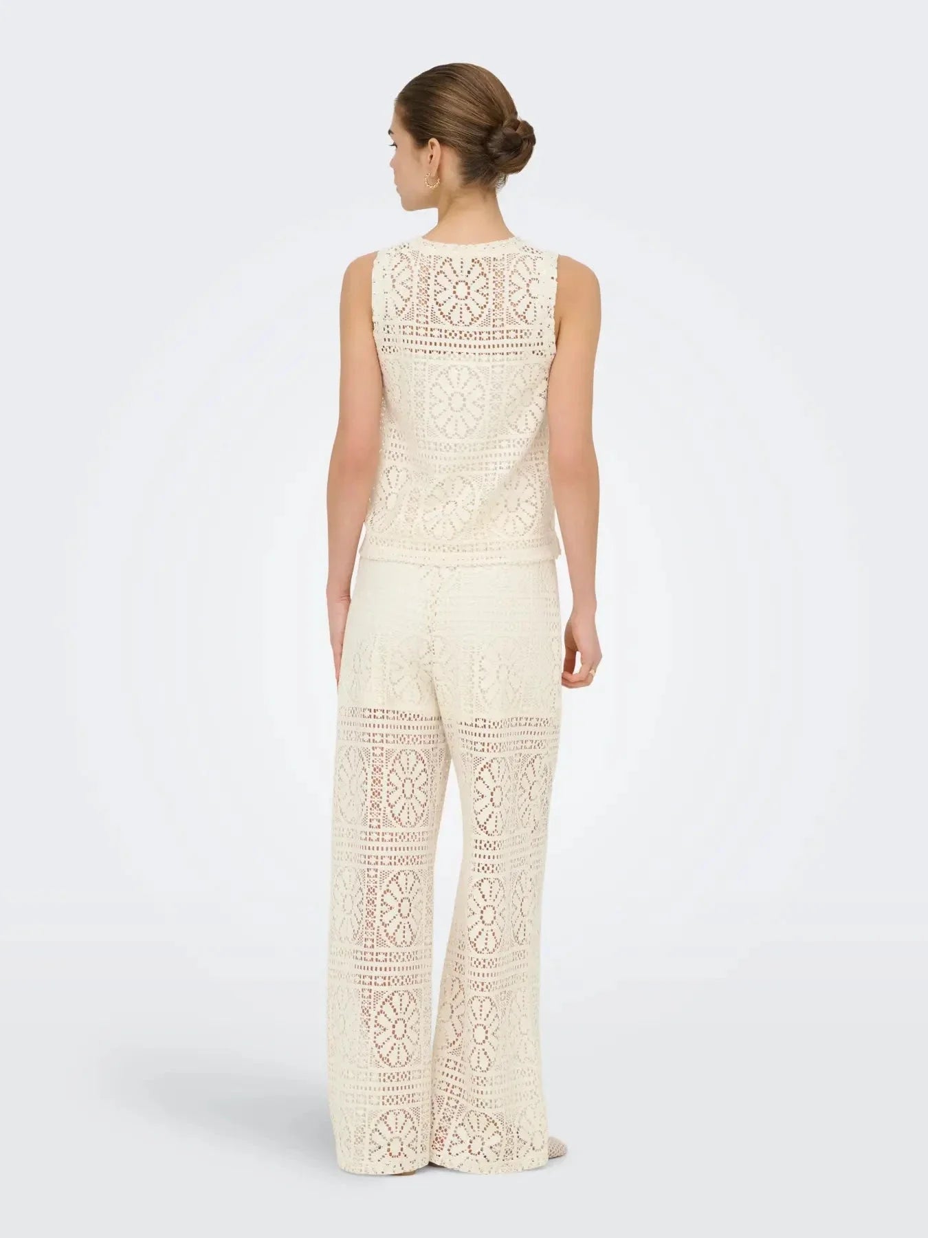 Szerokie spodnie marki Only z koronkowym wzorem w odcieniu złamanej bieli. Spodnie mają elastyczny pas i są wykonane z poliestru z recyklingu oraz bawełny.