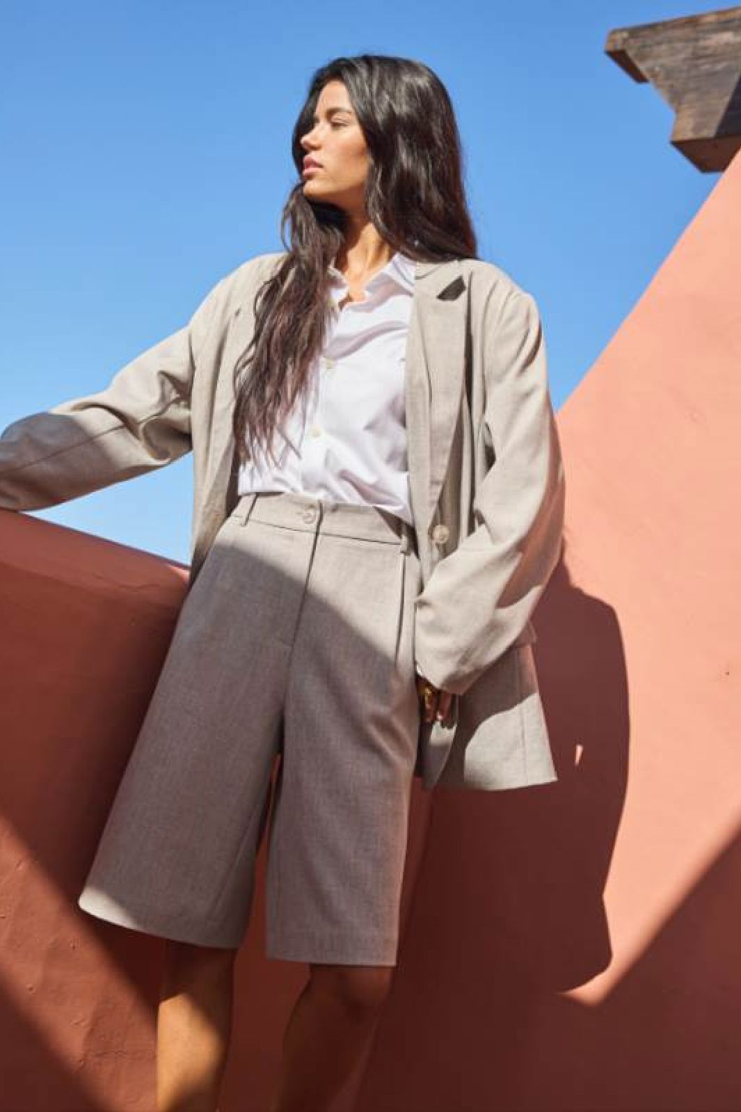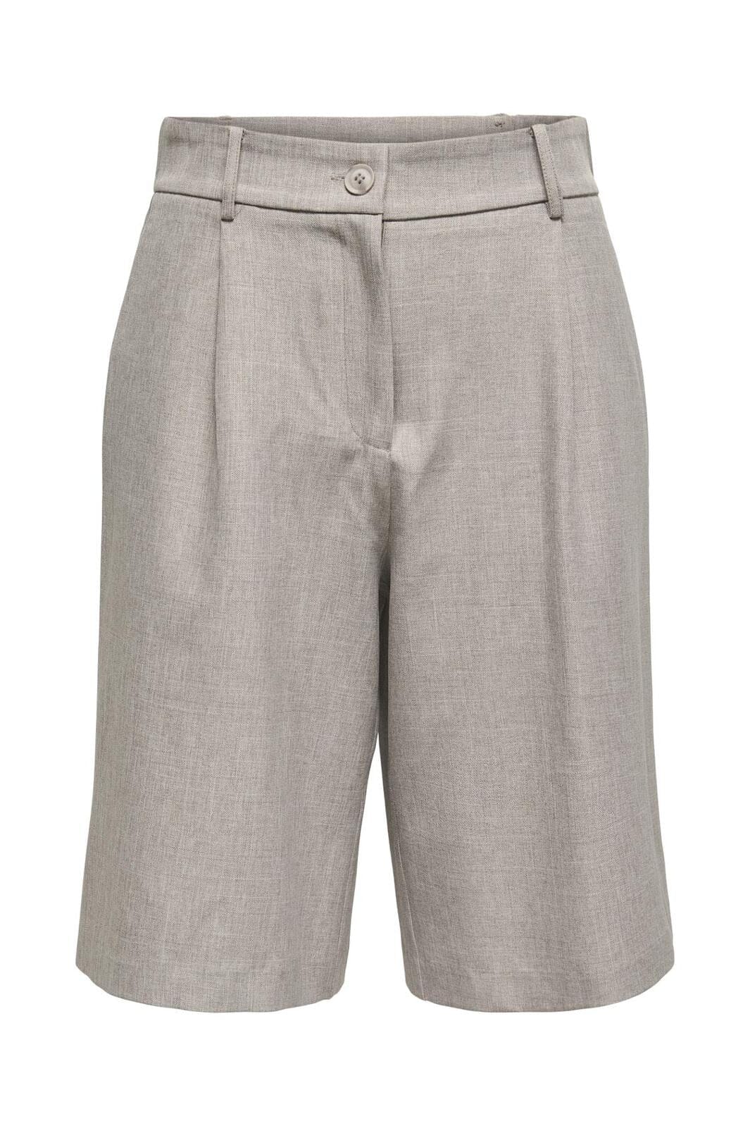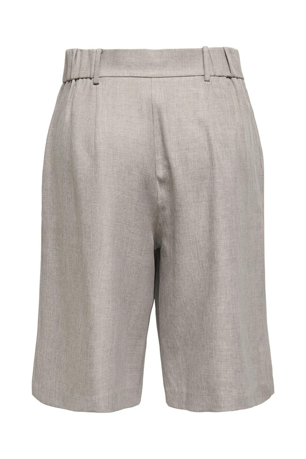 Szorty bermudowe do kolan w jasnoszarym melanżu z wysokim stanem i luźnym krojem. Szorty mają fałdy z przodu oraz praktyczne kieszenie boczne i szlufki na pasek.