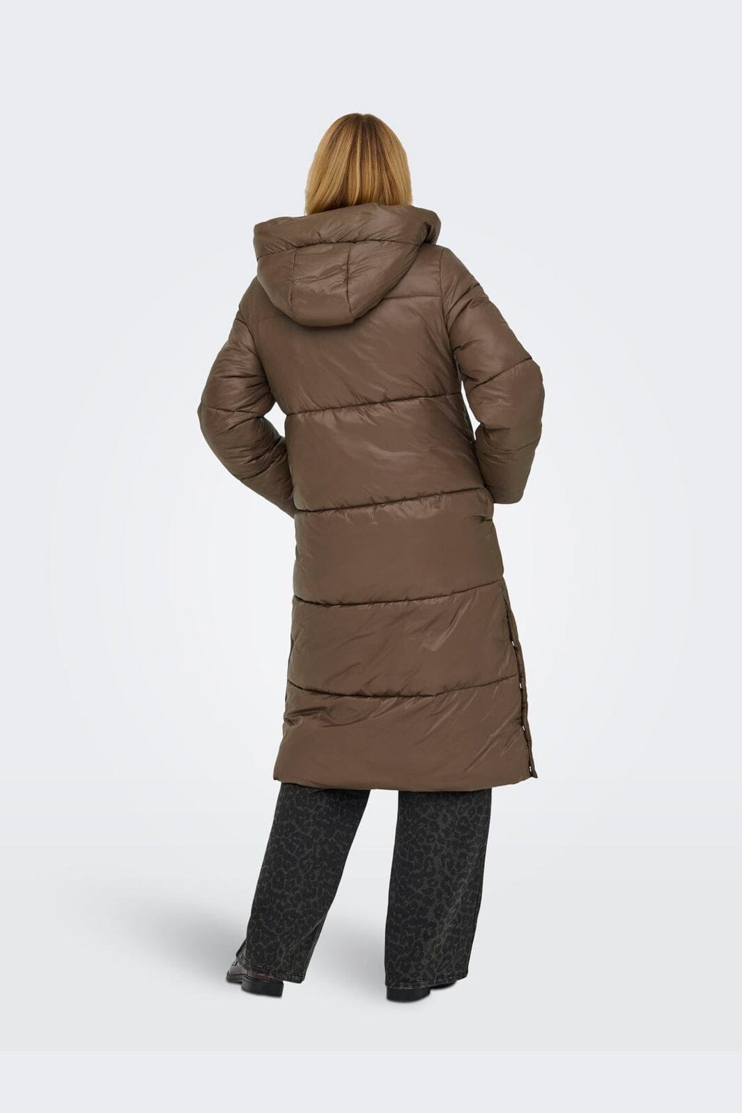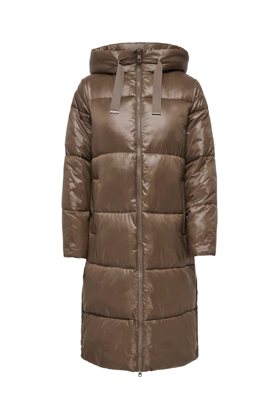 Długa kurtka puchowa od Only w brązowym kolorze. Kurtka wykonana jest w 100 % z nylonu i ma kaptur ze sznurkiem.