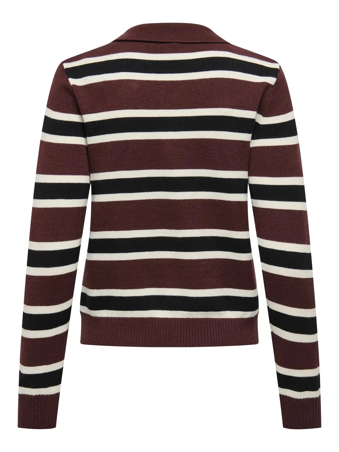 Stripowany sweter polo od Only w brązowych i bordowych odcieniach z czarnymi i białymi paskami. Sweter ma kołnierzyk polo i długie rękawy.