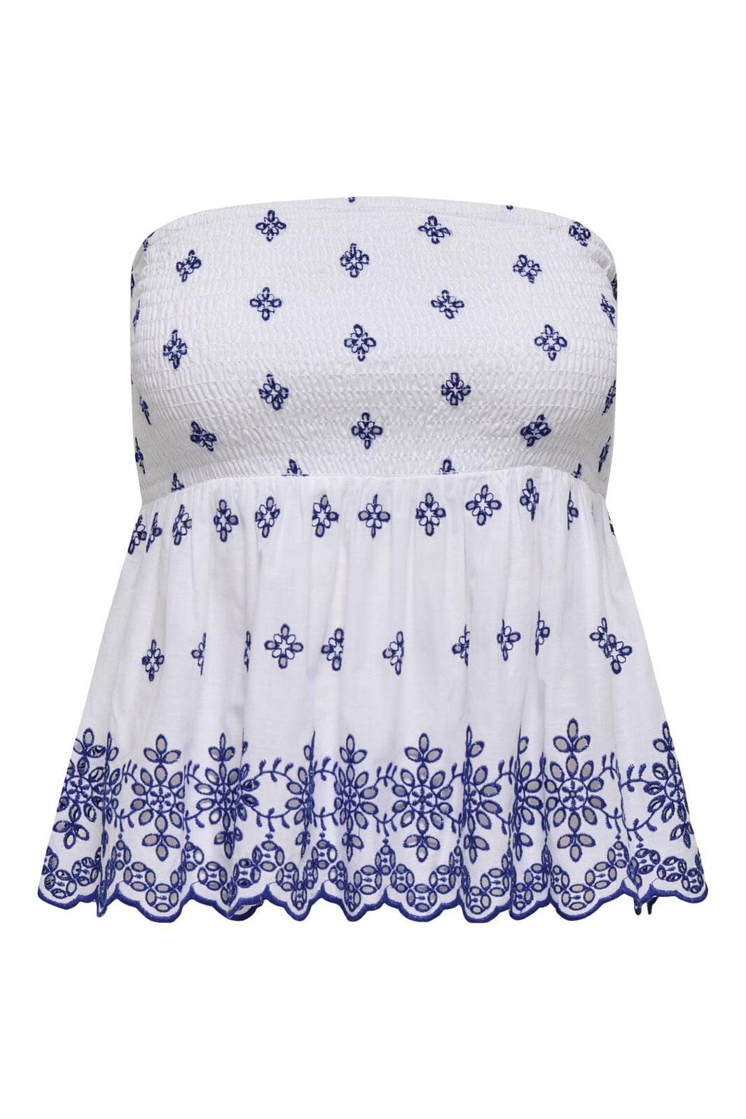 Bandeau-top od Only w białym kolorze z niebieską haftem. Top ma detale smock w górnej części i falbany na dole. Bezramienna model ma kwiatowy wzór i regularny krój.