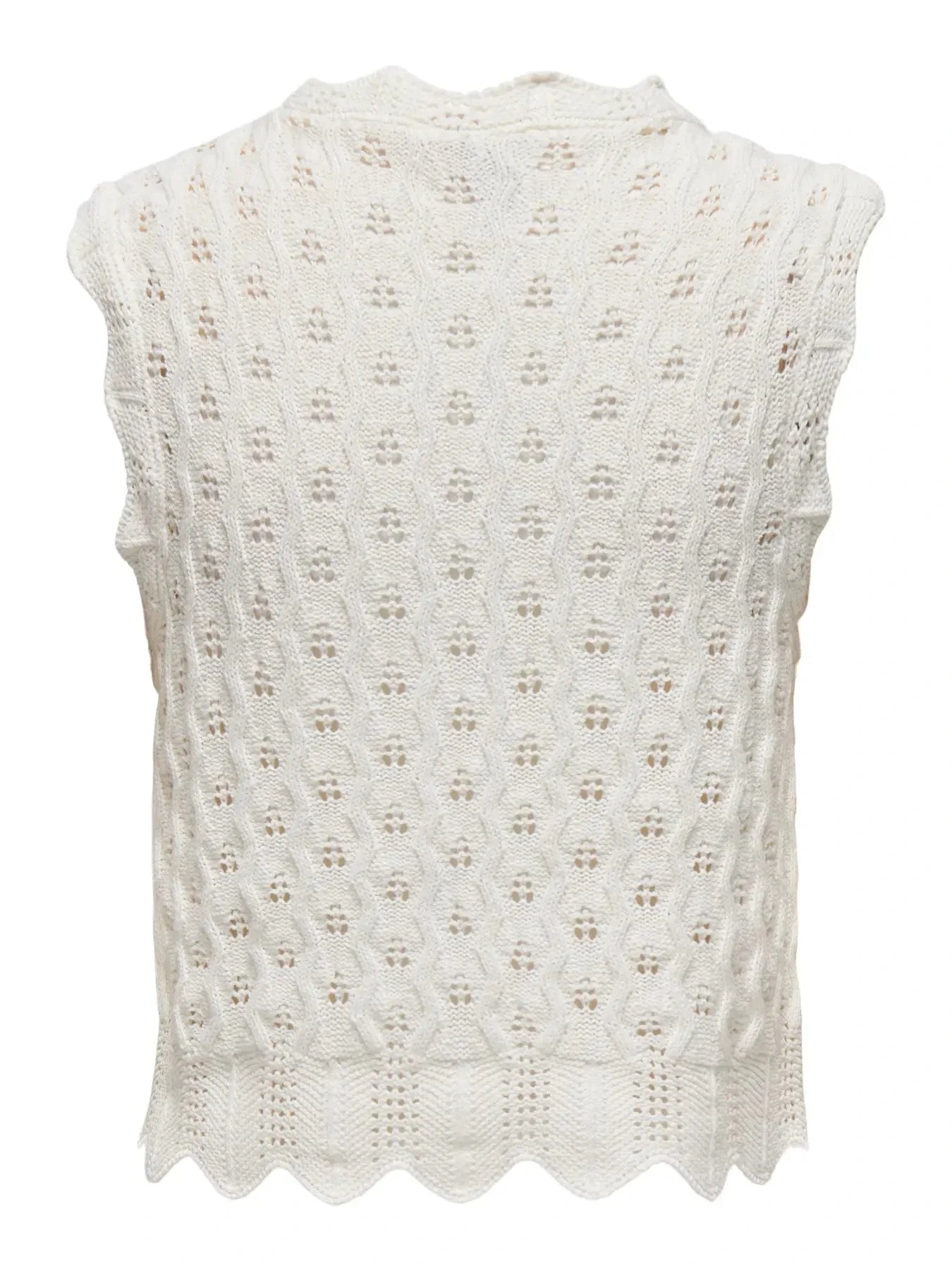 Dzianinowy top marki Only w kolorze złamanej bieli. Top ma dekoracyjne szwy i koronkę oraz wzór z małymi dziurkami.