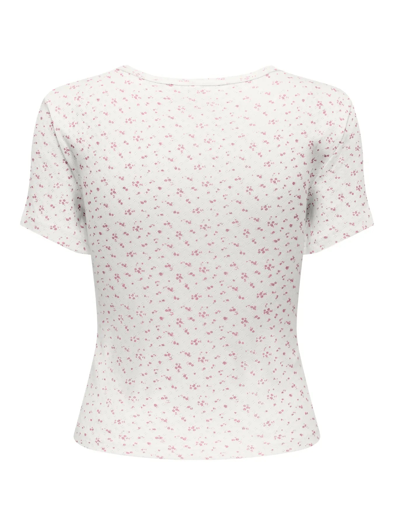 Baby t-shirt od Only z małymi jasnoróżowymi kwiatami na jasnym tle w odcieniach off-white, kremu i bieli.