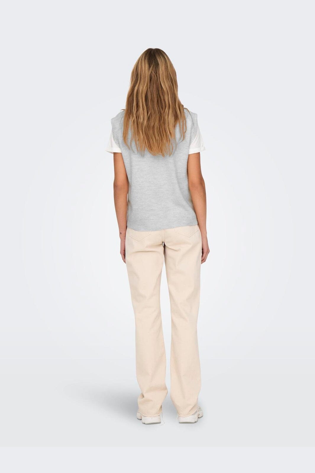 Dzianinowa kamizelka marki Only w jasnoszarym odcieniu z haftowanymi złotymi sercami. Kamizelka ma okrągły dekolt i bezrękawowy krój z prążkowanymi ściągaczami.