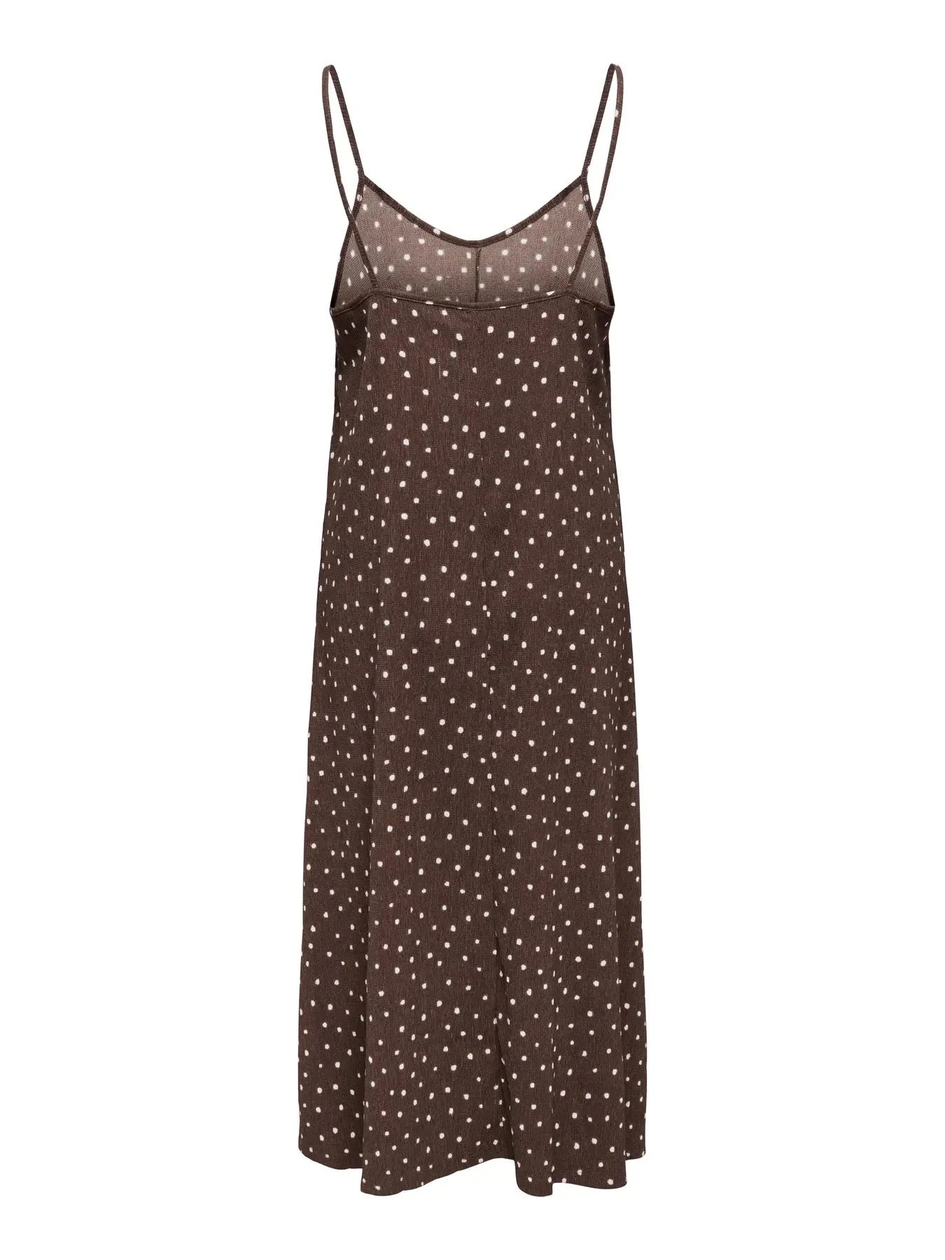 Brązowa sukienka w białe kropki od Only. Sukienka ma cienkie ramiączka typu spaghetti oraz dekolt w kształcie litery V z luźną sylwetką w kształcie litery A.