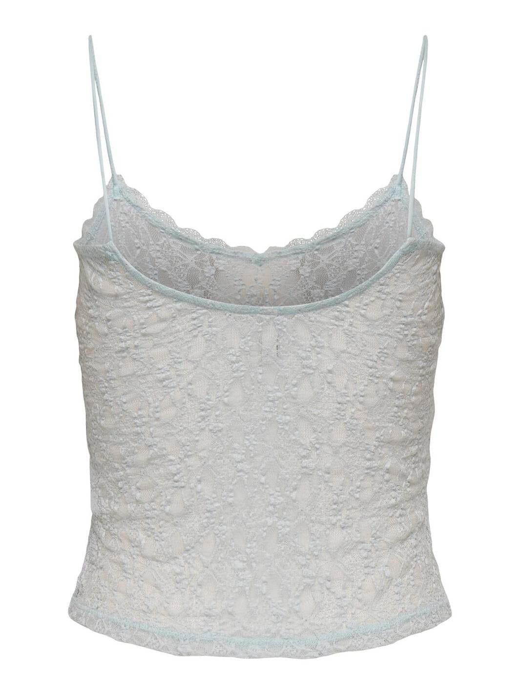 Niebieski top od Only z koronkowym wzorem na całej powierzchni. Top ma cienkie ramiączka i okrągły dekolt z falbaniastymi krawędziami. Dobrze przylega do ciała z dopasowanym krojem slim fit.