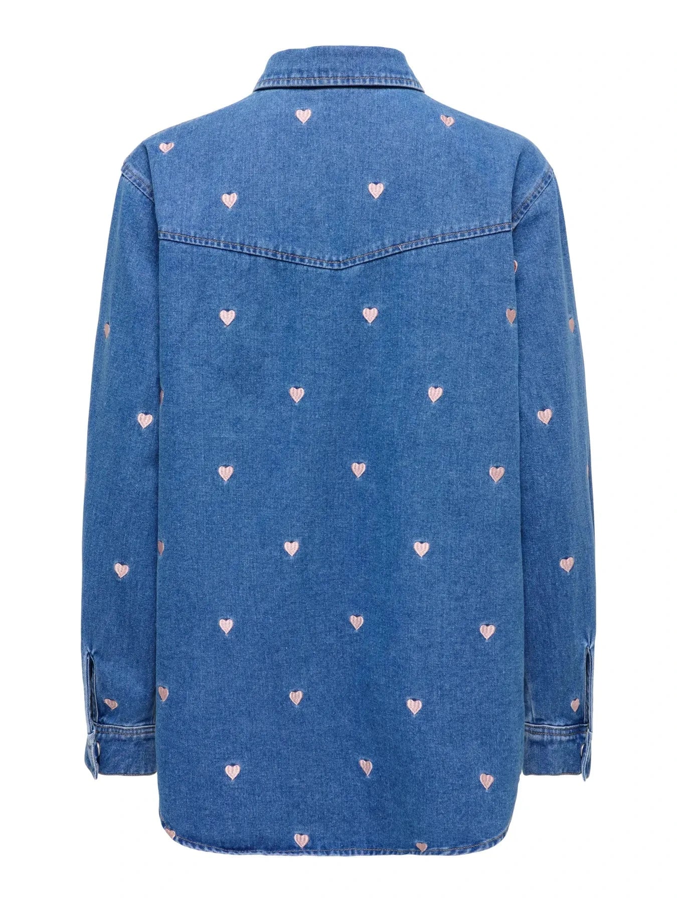 Dżinsowa koszula marki Only w średnim odcieniu niebieskiego z małymi haftowanymi serduszkami rozmieszczonymi na całym materiale. Koszula ma długie rękawy i klasyczny kołnierzyk koszulowy.