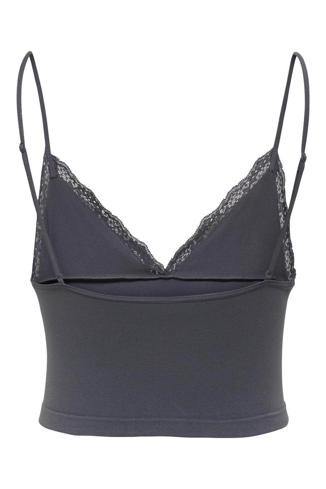 Szara singlet od Only z koronkowymi detalami wzdłuż dekoltu V. Top ma dopasowany krój i wąskie ramiączka, które zapewniają gładką sylwetkę pod ubraniem.