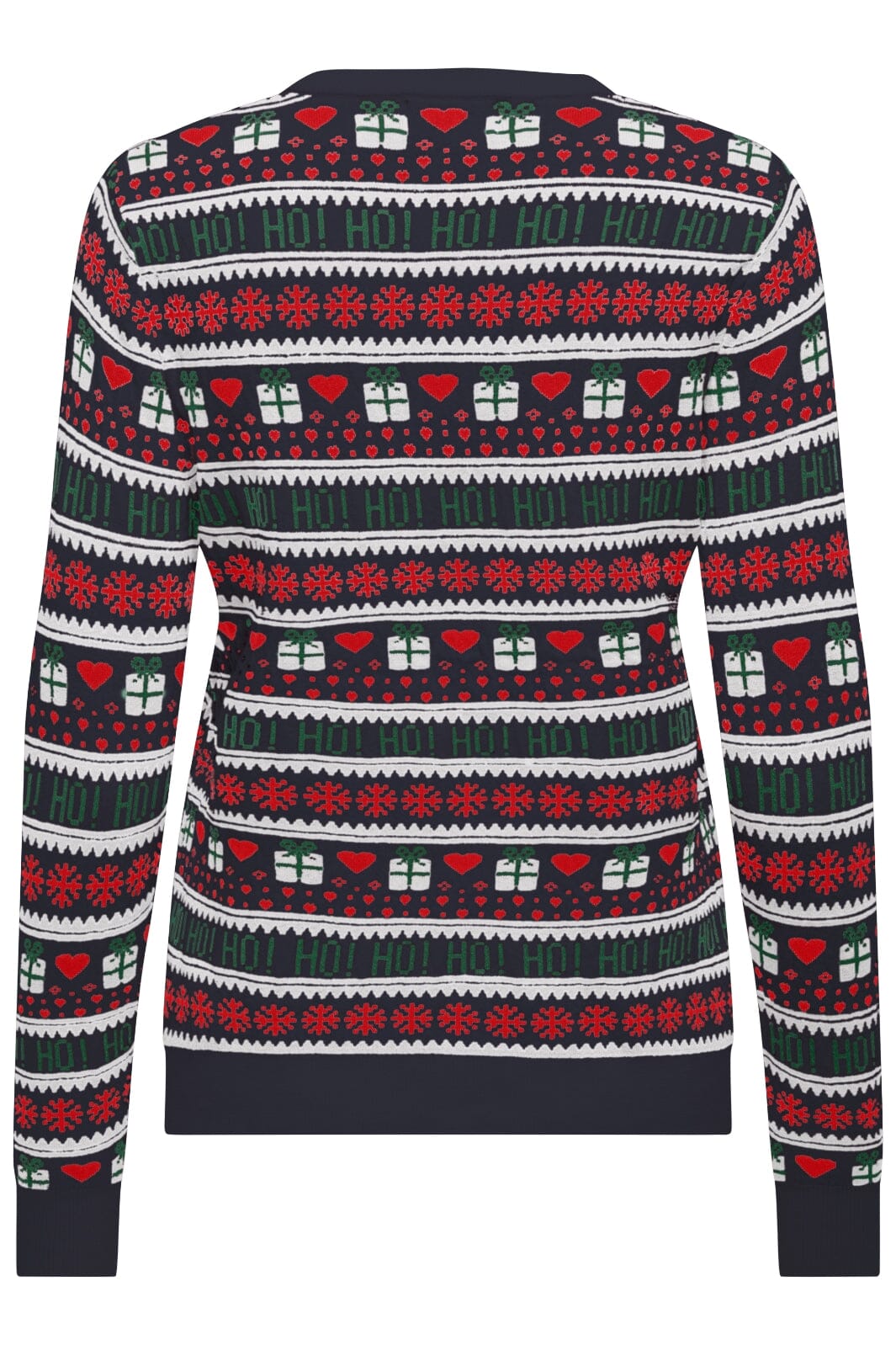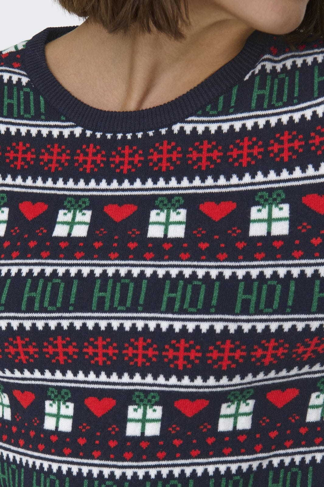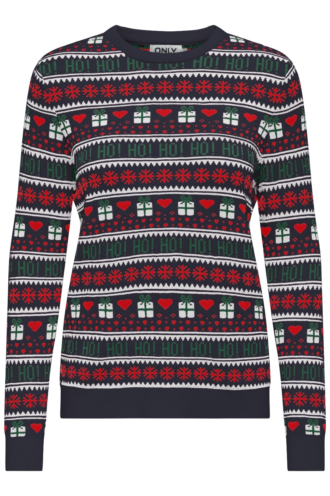 Sweter świąteczny od Only w ciemnoniebieskim kolorze z tradycyjnym wzorem bożonarodzeniowym. Sweter ma czerwone serca, zielone prezenty i białe płatki śniegu w paskowanym wzorze, który biegnie dookoła.